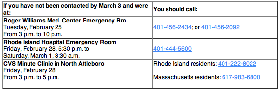 Hospital/clinic staff at these facilities are identifying patients from their records and are calling individuals to assess their risk and make recommendations and arrangements for vaccination. Patients (or people accompanying patients) who were at the sites at the times listed below who have not been contacted by March 3rd should call the appropriate number indicated below.