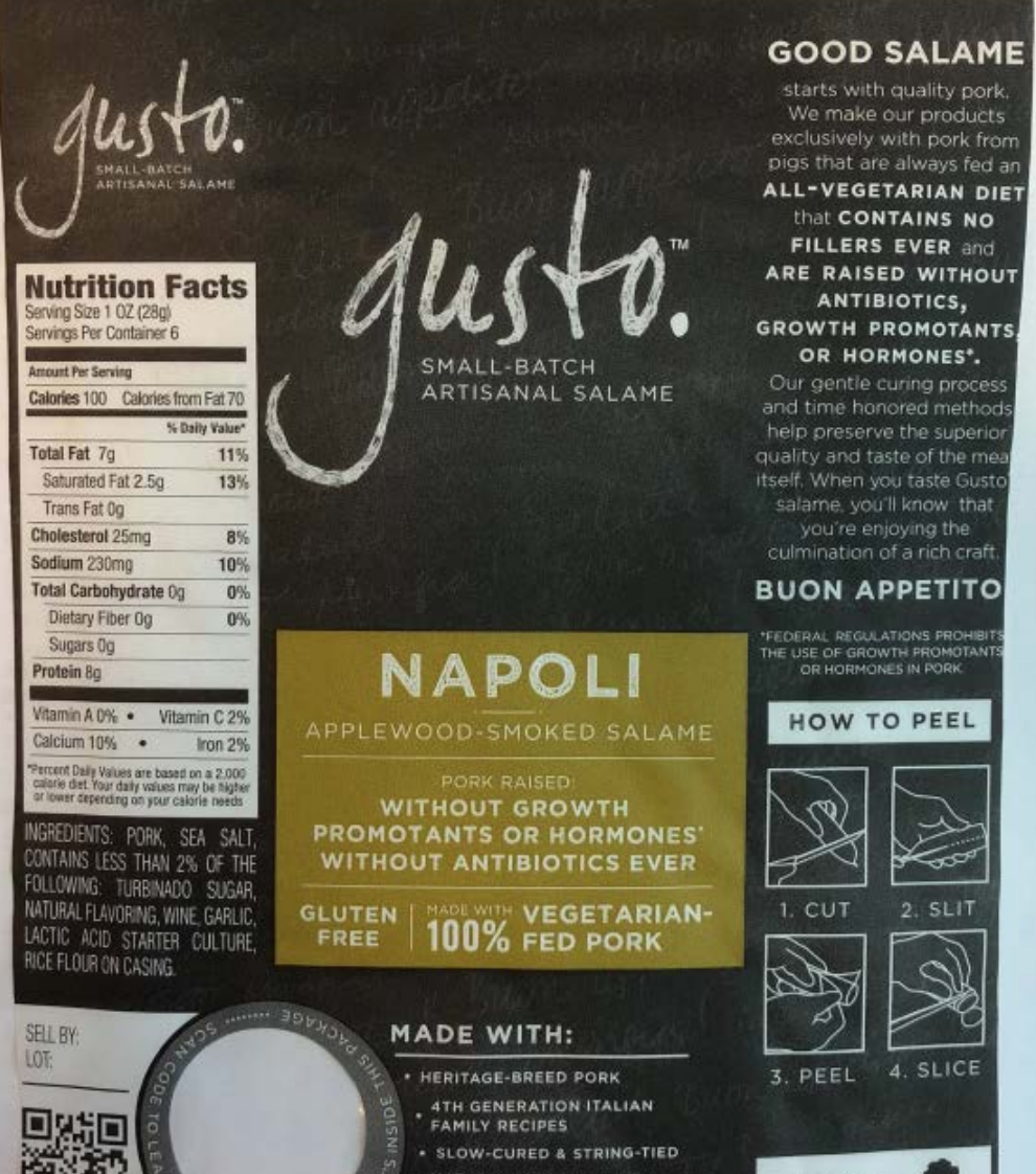- 6 oz. packages of “Gusto Sopressata Black Peppercorn Salame,” lot code 1000012811.
