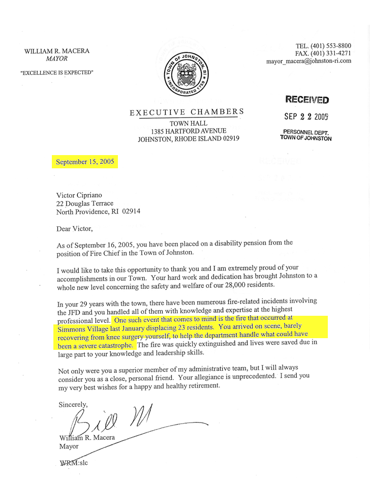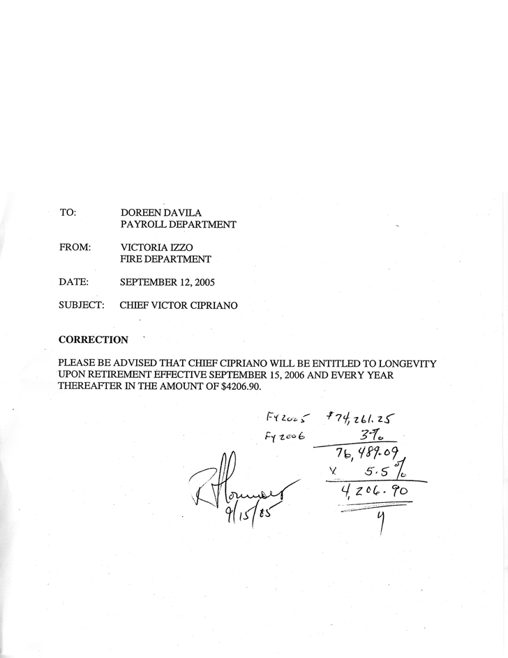 This 2004 memo shows that Macera gave Cipriano the same pension benefits that members of the firefighter union receive - even though as fire chief, Cipriano was no longer a member of the union.
