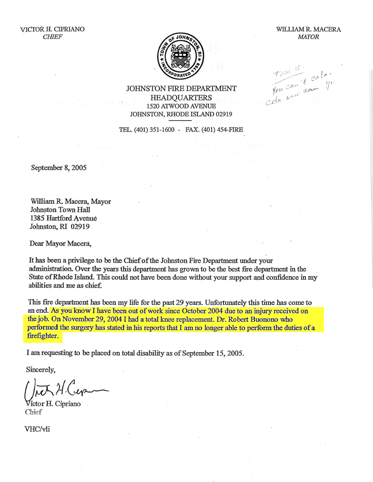 This is the 2005 letter from Cipriano to the mayor, in which he asks if he can be put on a disability pension, due to a knee injury.
