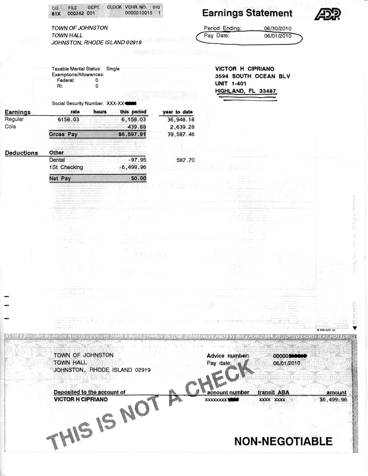 This pay stub shows how much Cipriano has earned so far in 2010. It does not include his longevity pay, which is sent to him in one lump sum in the fall (see the above document for an explanation of how his longevity pay was calculated). The pay stub lists his address in Florida, but Cipriano recently moved back to Johnston.