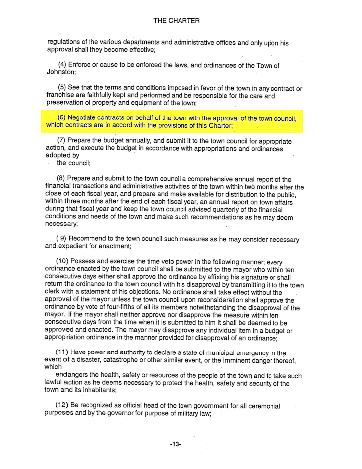 Below is an excerpt from the section of the Johnston town charter that deals with the powers of the mayor. The highlighted text states that the mayor can negotiate contracts, but the town council must ratify them. However, there is no record of the town council ever holding a vote on the deal that Macera awarded to Cipriano.