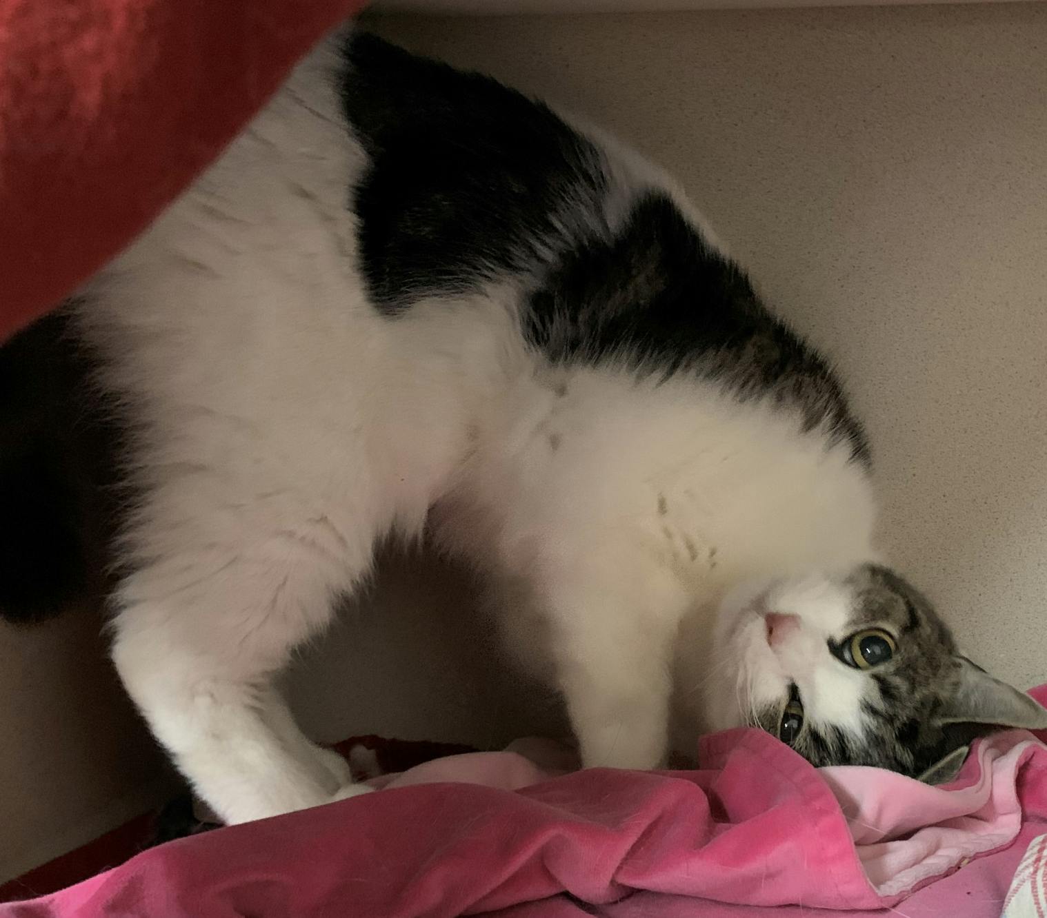 I'm Alley Cat! I'm a young male cat found by my PARL friends as a stray. I love to talk to you and need a little work on my manners, but I have a lot of love to give (and pets to accept)! I might be okay in a home with another animal, depending on the cat or dog in question, but I'd do best in a home without children. In terms of my personality, I’m a cat on a mission: PARTY! I love to play and explore and test my limits. I’d love to play with you, but I can make a toy out of anything: pencils, post-it notes, potatoes. If you’re looking for some laughs and someone to liven up the party, think about inviting me.