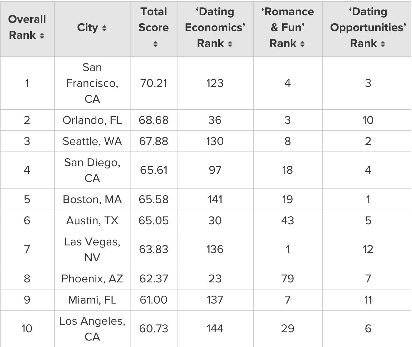 "With your love life in mind, our data team compared the 150 most populated U.S. cities based on 29 key indicators of a location conducive to a healthy single-but-looking disposition. Our data set ranges from “share of single population” to “number of online dating opportunities” to 'nightlife options per capita.' Continue reading below for the winners, expert dating advice and a full description of our methodology."