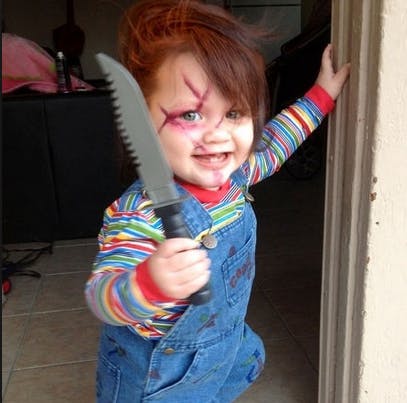 Not what you want to see, an infant dressed up as Chucky holding a knife on Halloween.