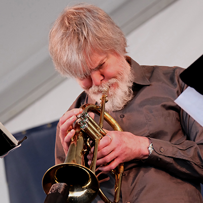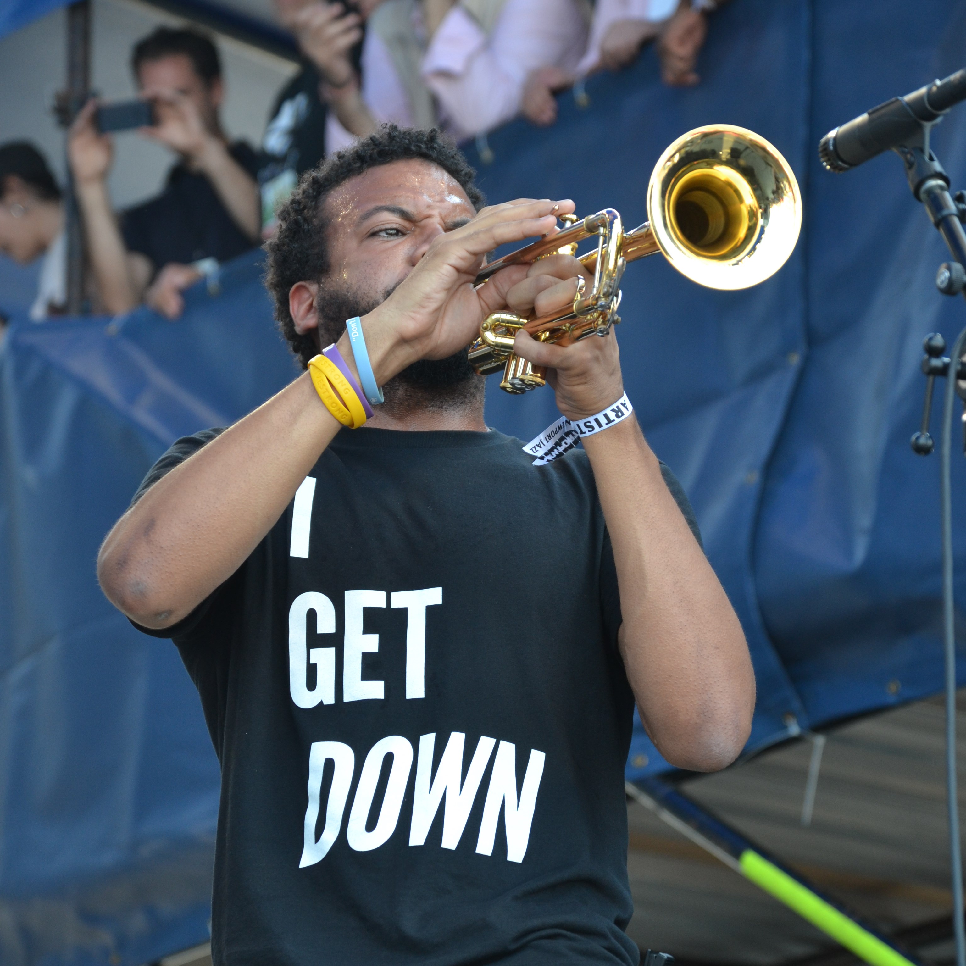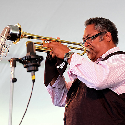 John Faddis led a three trumpet attack Sunday on the Quad Stage with the help of his able band and fellow horn blowers Sean Jones and Marquis Hill. Faddis, who is known for playing some of the highest notes possible on the trumpet, impressed with originals and covers including the Miles Davis classic "Seven Steps to Heaven." (Photo: Rick Farrell)