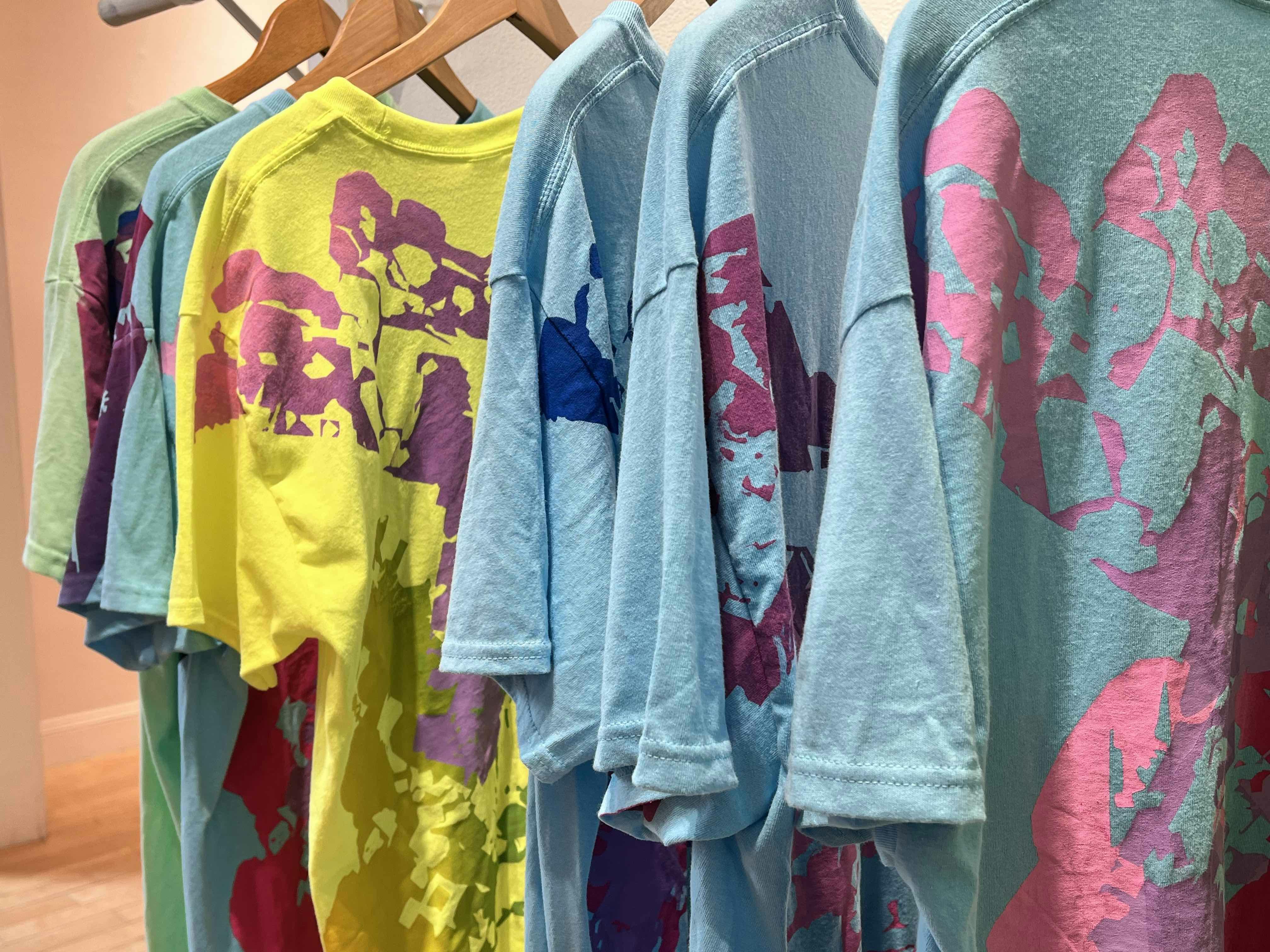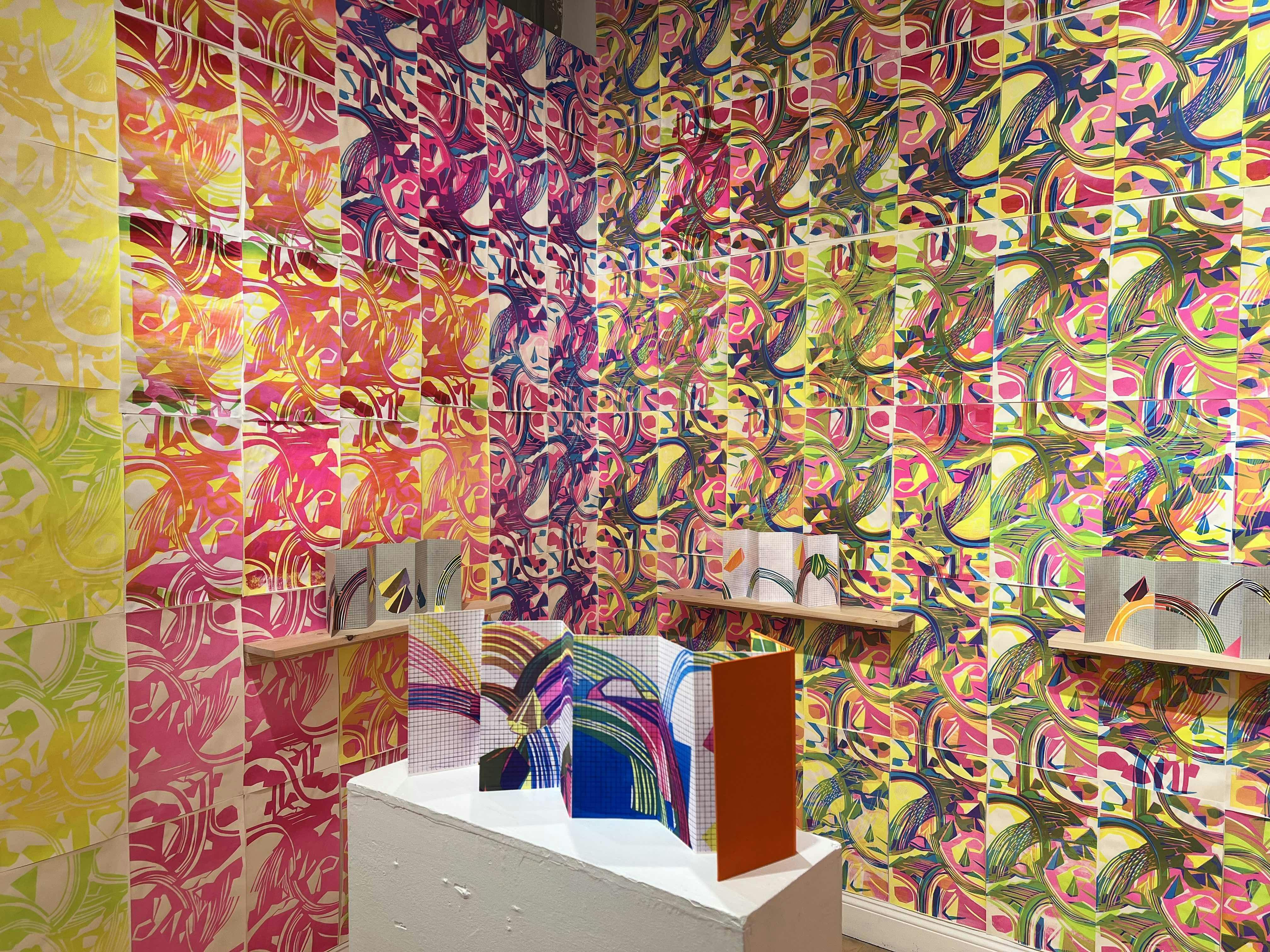 Henderson’s solo show is at once wide-ranging and tightly considered. There are prints, books, and works on fabric. An installation of printed tee shirts greets visitors when they enter the gallery, and several walls of the Project Space are wallpapered with Henderson’s prints, resulting in a dazzling effect. Beautifully produced books unfurl prints that merge a variety of techniques, including intaglio and silkscreen. The throughlines in the collection of works on view are vivid palettes and sharply graphic designs.