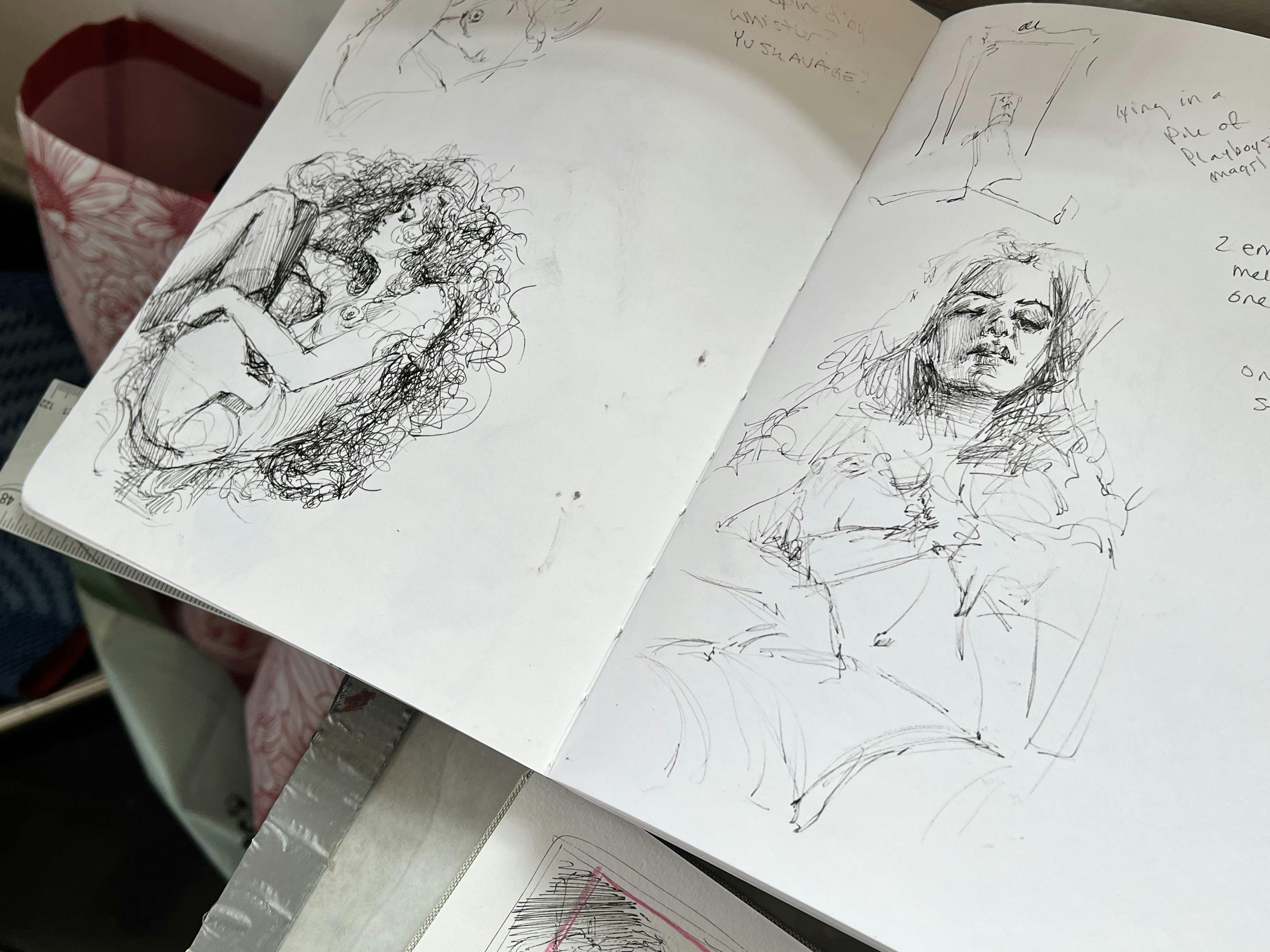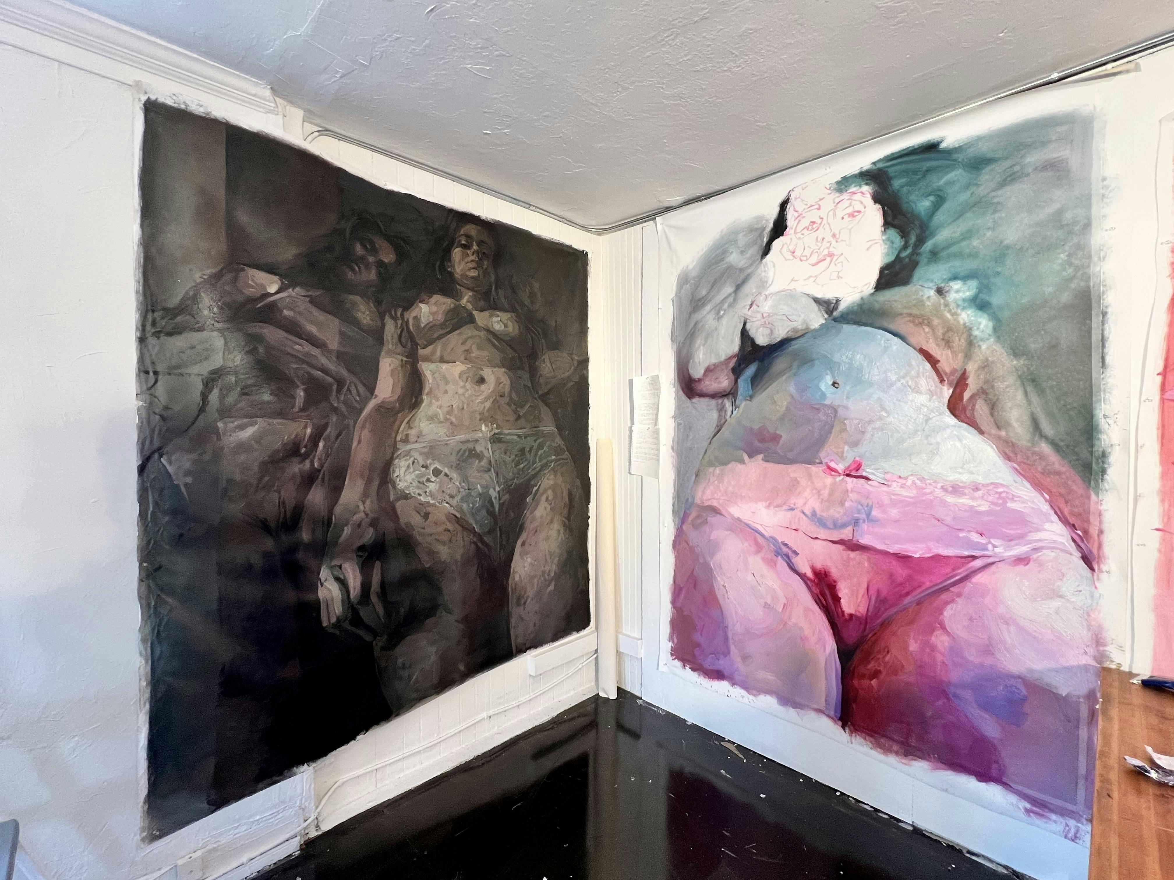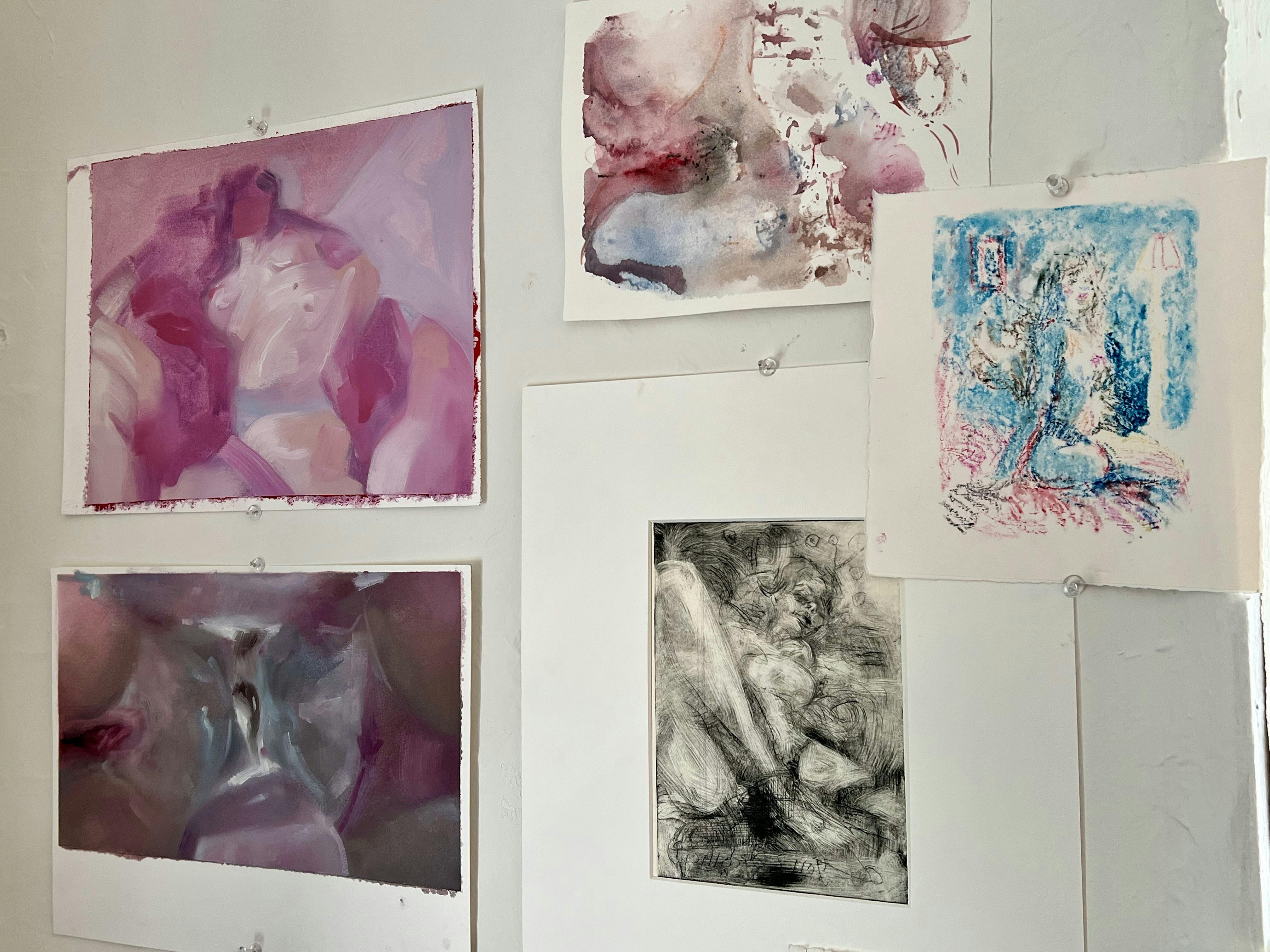 In Puccio’s work, a palette of soft pinks, purples, and blues underscores her subjects. She also plays with scale. On two walls of her studio, a trio of current paintings includes wall-sized characters that look down on their viewers. In the opposite corner, intimately sized monoprints, etchings, and oils show off the facile hand she makes use of when making this work. In a series of small studies that zoom in on the body, carefully depicted folds of flesh are executed with expert brushwork.