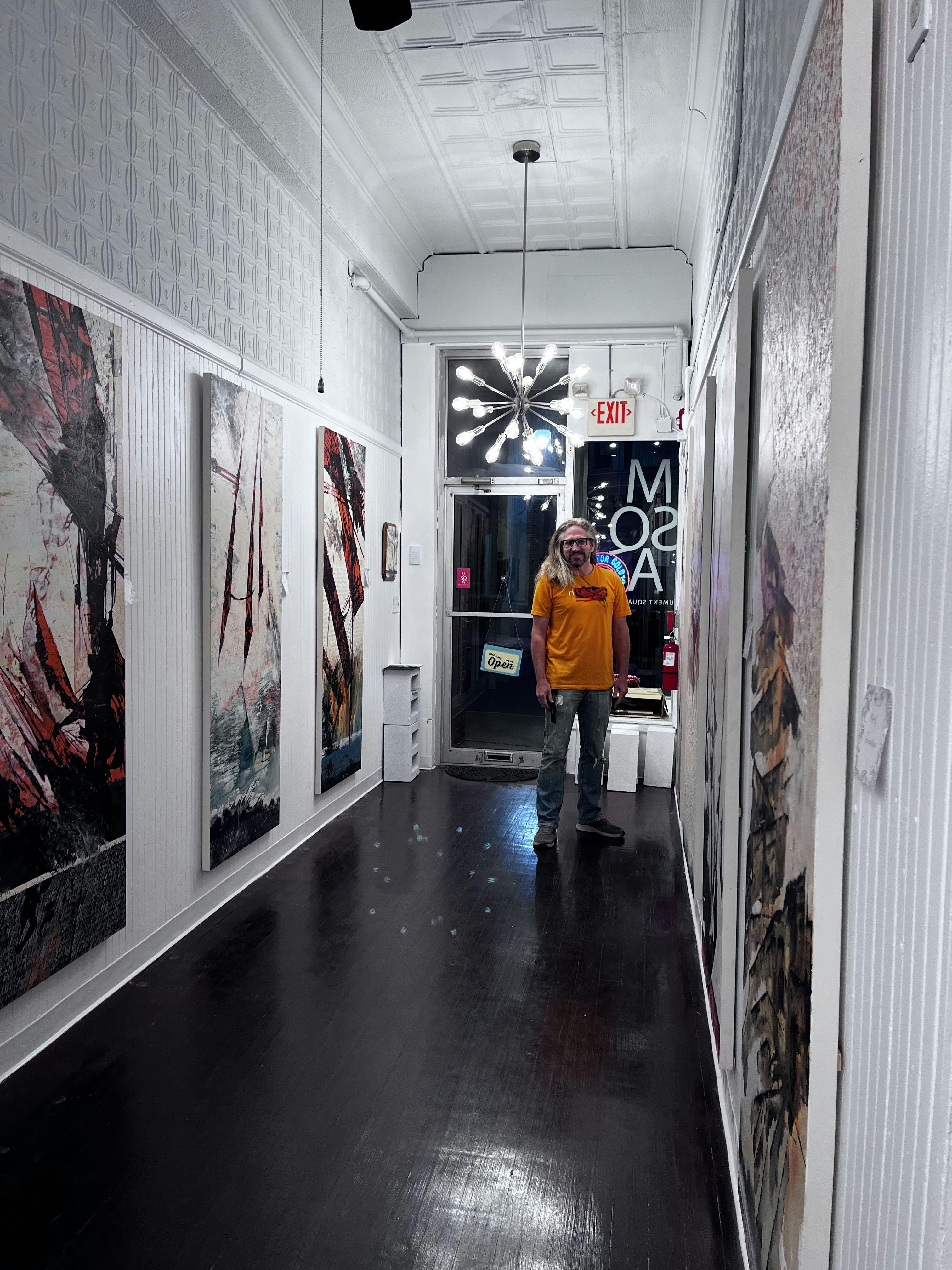 One of the recurring motifs in Morris’ work is the inclusion of text alongside swaths of abstract color and texture. For his show in Woonsocket, he has even covered the gallery’s front window in text. When asked about this element of his practice, Morris replies, “I use textual components in my work as a link between the tangible and the intangible, similar to a legend on a map or a key that opens the door connecting two spaces. It creates a covenant with my audience and an undertone of unspoken understanding between what we can manipulate physically and mentally. It grounds my experience to a foundation from which I can grasp the connections that govern so much of the world around me.”