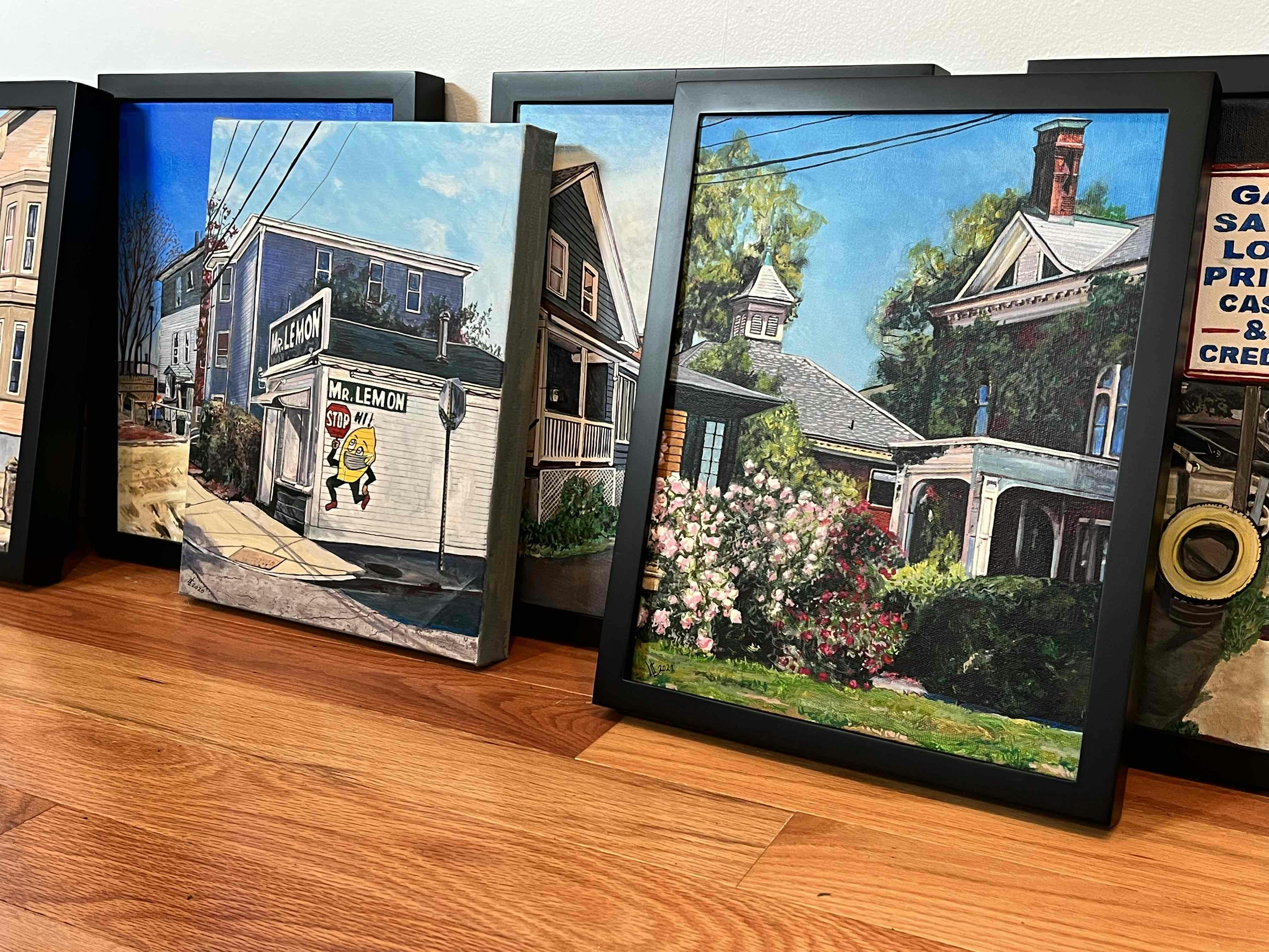 Crenca produces his paintings by walking the city’s streets and exploring its diverse neighborhoods. Landmarks recognizable to residents from all areas of Providence show up in Crenca’s art and his process involves taking himself out of the work in order to allow viewers to really see and explore the streetscapes he paints. Snapping hundreds of photos and looking closely on his own, he returns to his studio to transform canvases into poignant reflections on place. What emerges is a broad image of innumerable interwoven local stories set against the backdrop of the corner store, the construction site, the alleyway.