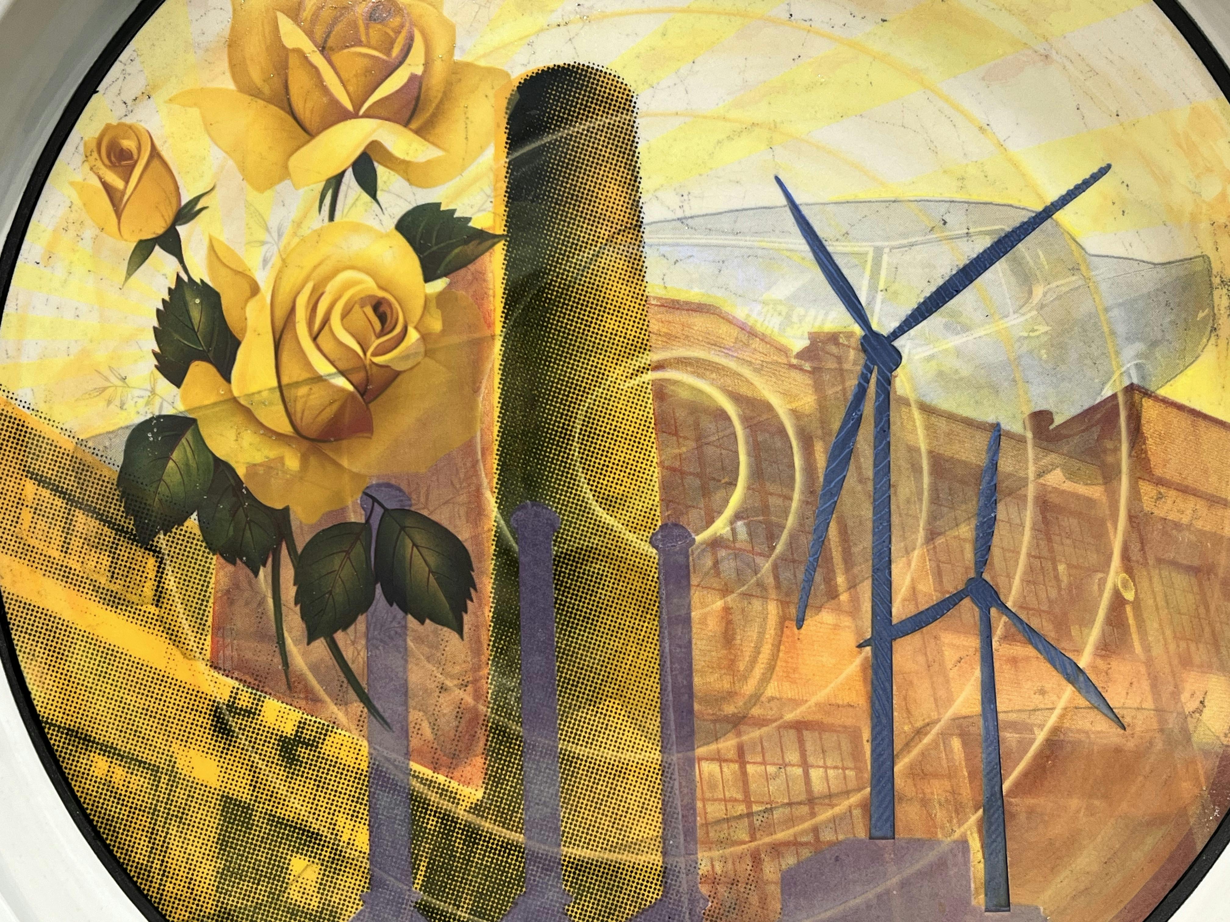 Allyn’s work starts with his love of cycling, which carries him to locations around the state. He takes photographs of architecture, landscapes, places that Rhode Islanders might find familiar and that he finds compelling. He then uses Photoshop to color separate his images and creates multiple silkscreens that he uses to apply the images to his ceramics. This technique ranges from small images or abstract patterns on cups and vases to large-scale explorations that show up on platter-like forms that can be laid flat or installed on a wall.