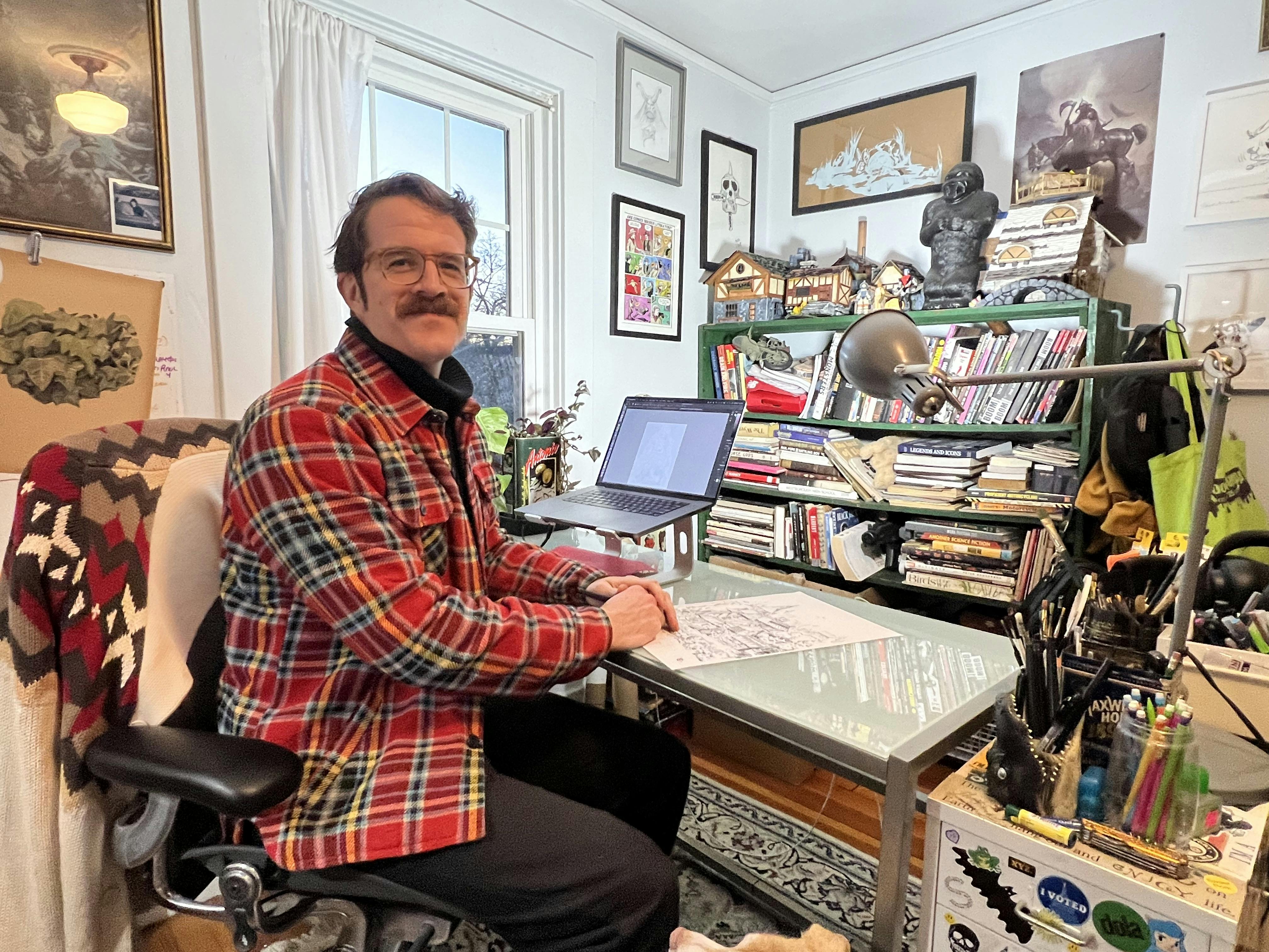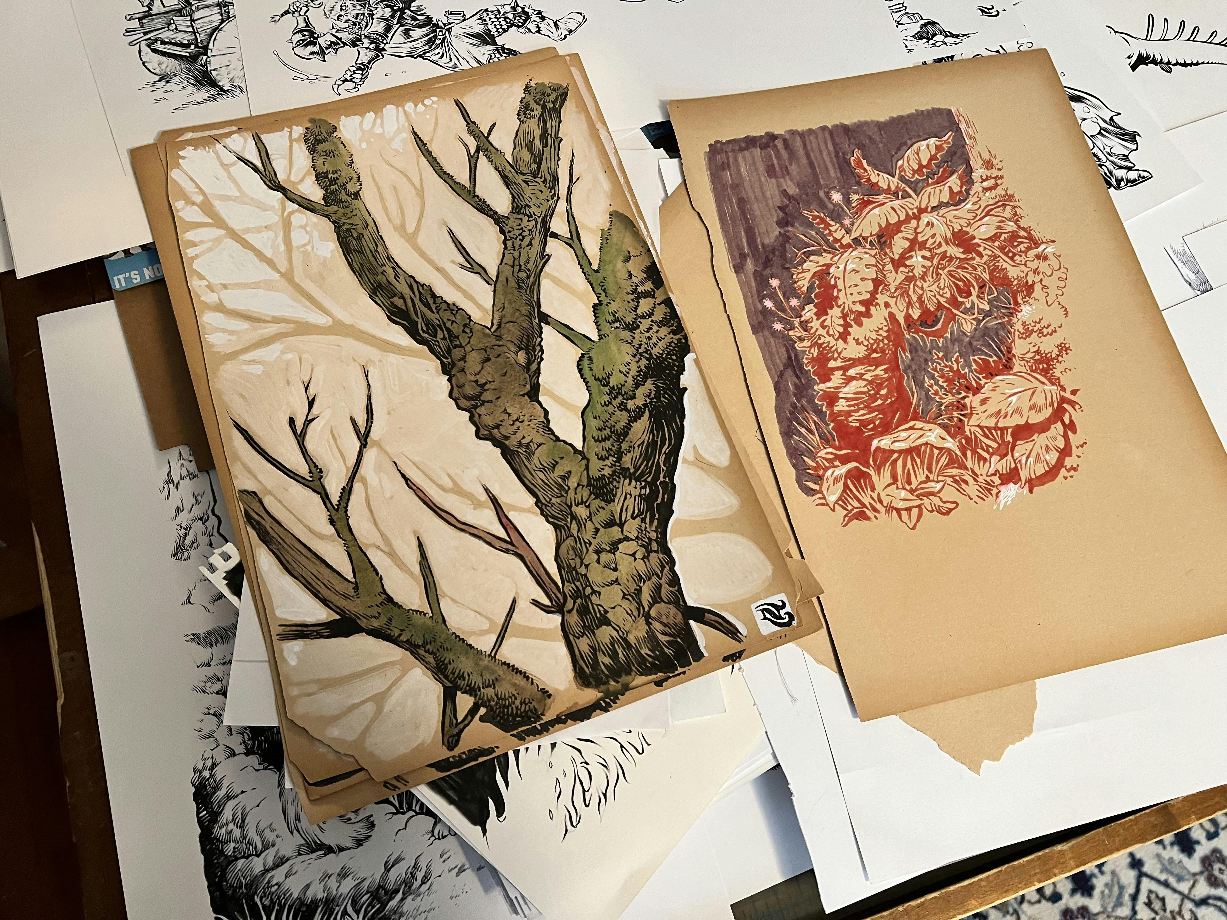 Asked about his process and where concepts originate, Nolan says, “Each idea comes from one of two places, either a client has commissioned me to draw their idea, or I'm pulling from my imagination. Most start with one or more sketches, and from there develop a larger drawing with brush and ink, which I'll color digitally.”