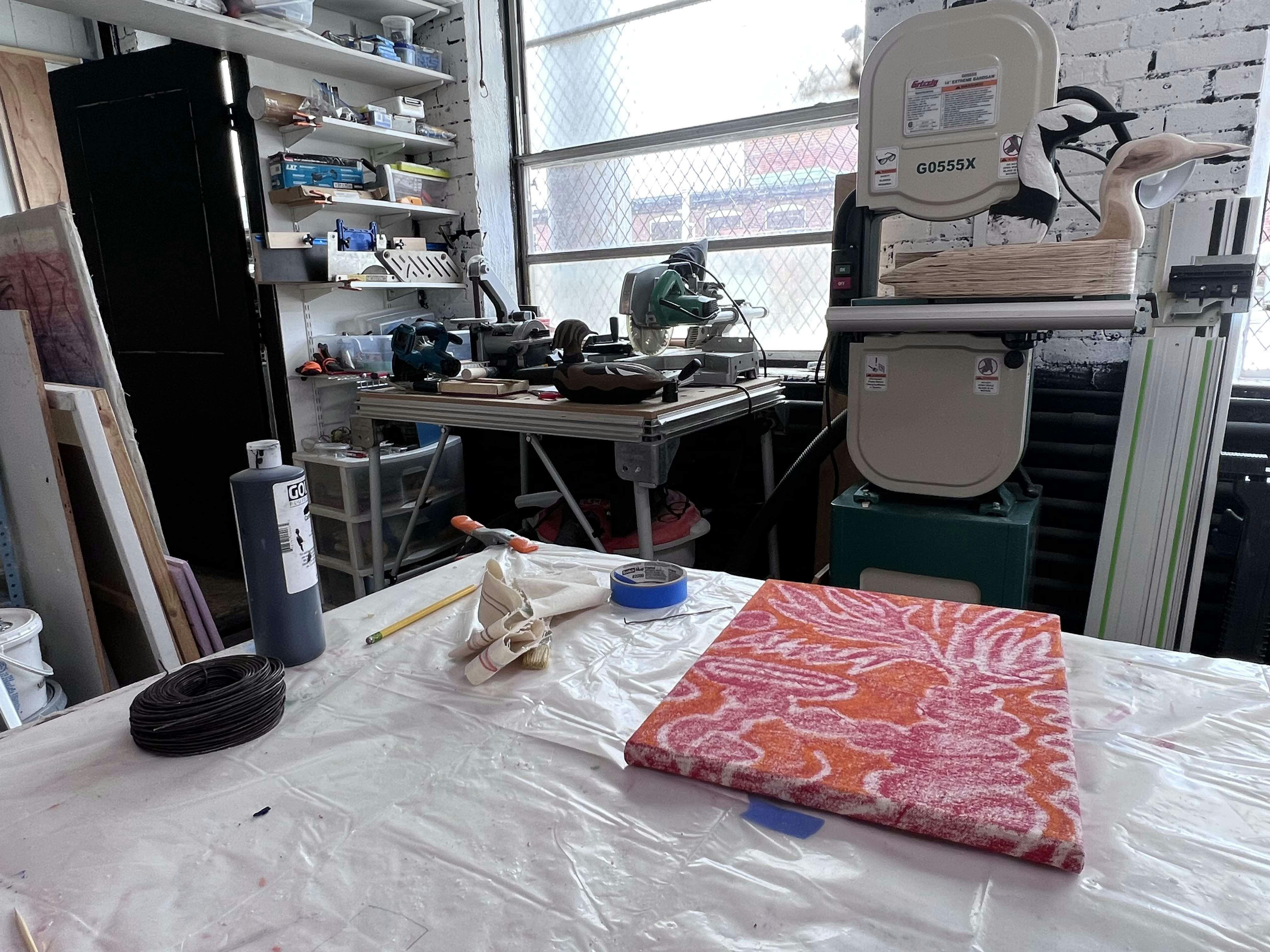 MacMillan’s own workspace is located in a former industrial building, tapping into the type of environment where his forebears in the state might have worked. Housed in a gritty brick factory not far from the Providence-Cranston line, MacMillan’s studio space boasts high ceilings and tall walls, perfect for making and mounting artworks. During a recent visit, new works created using foam, sand, and acrylic paint were on display. On the opposite side of the room, MacMillan’s work station includes tables used for painting and saws used for woodworking, a newer element of his creative practice.