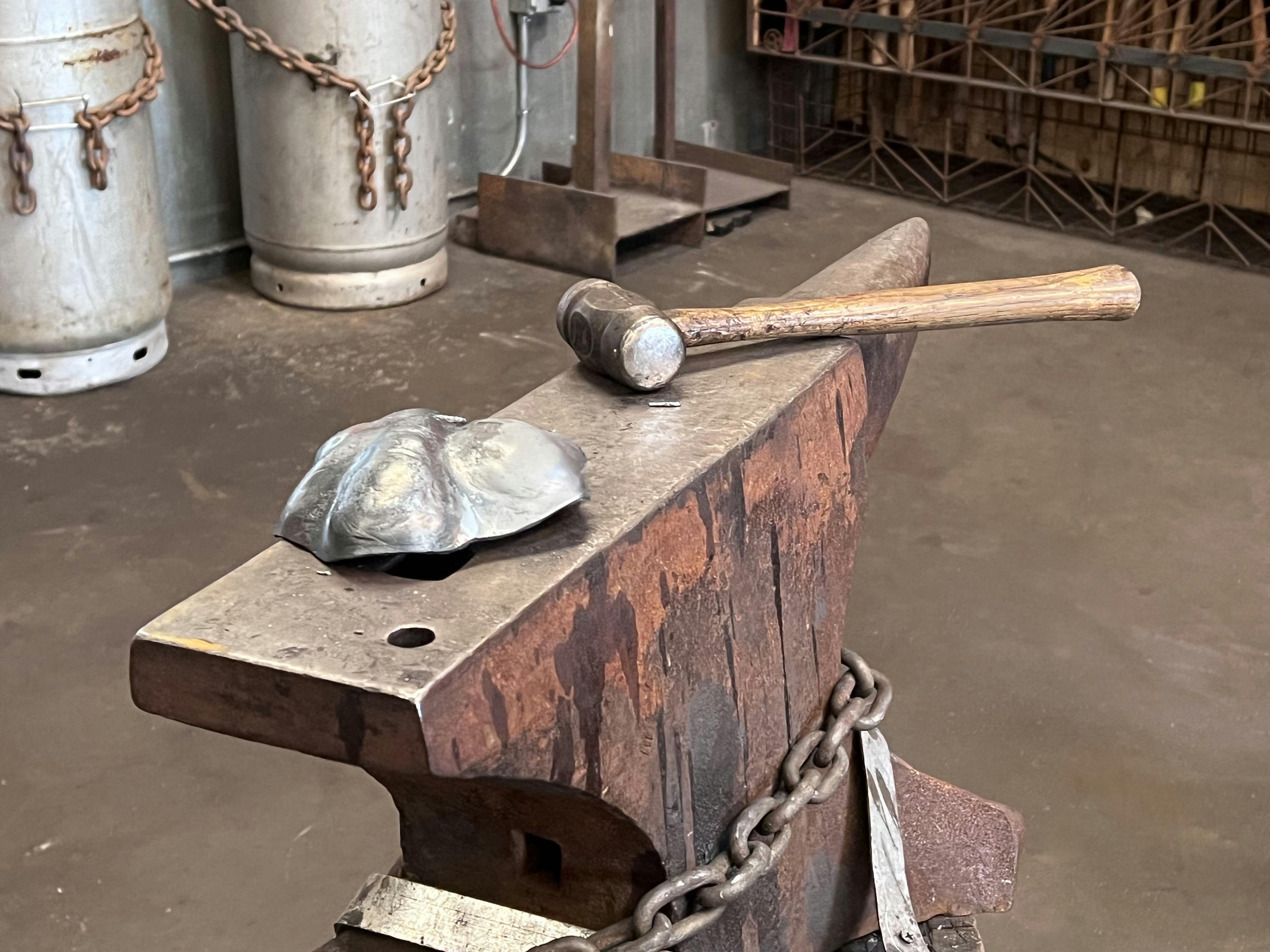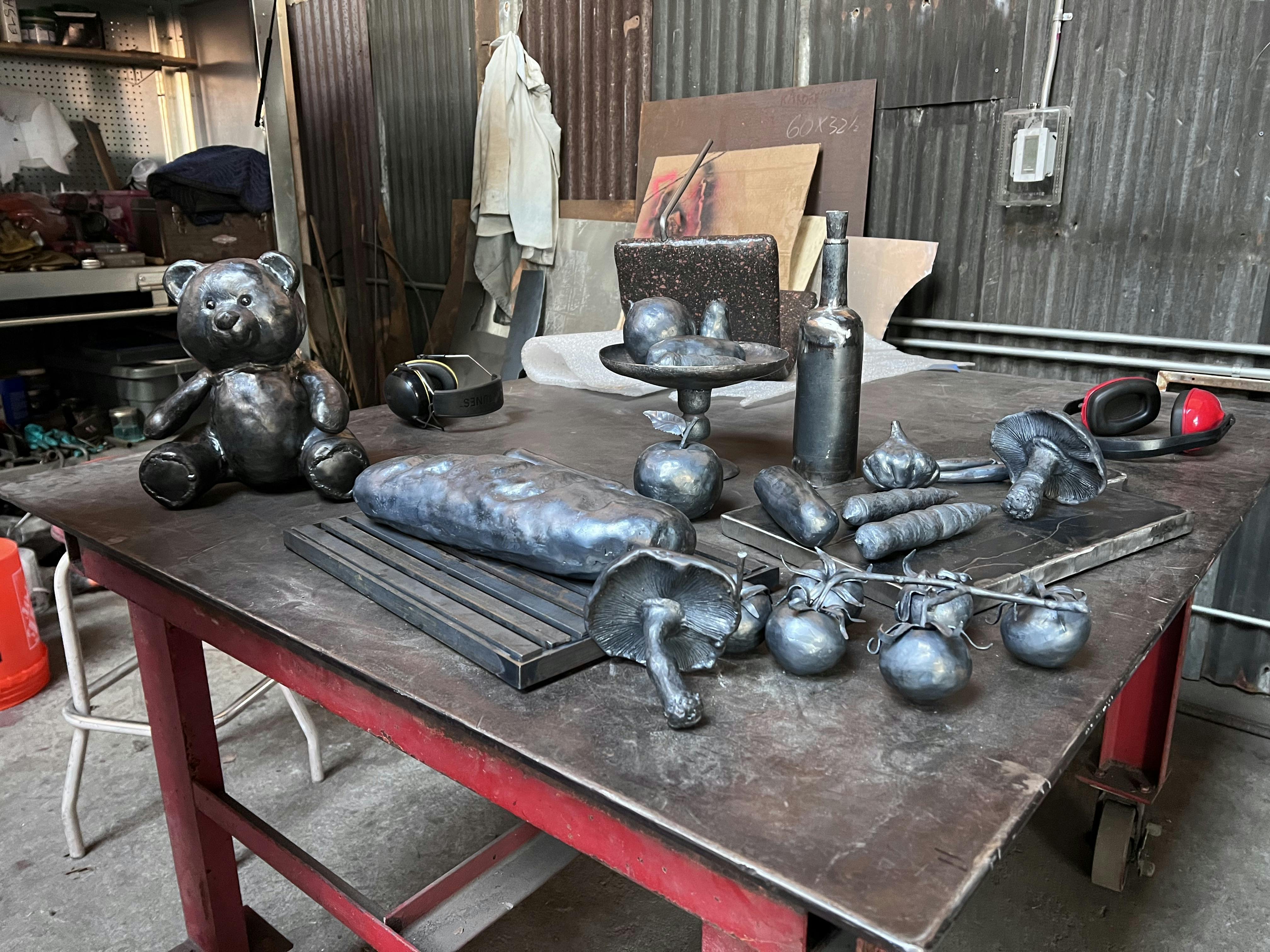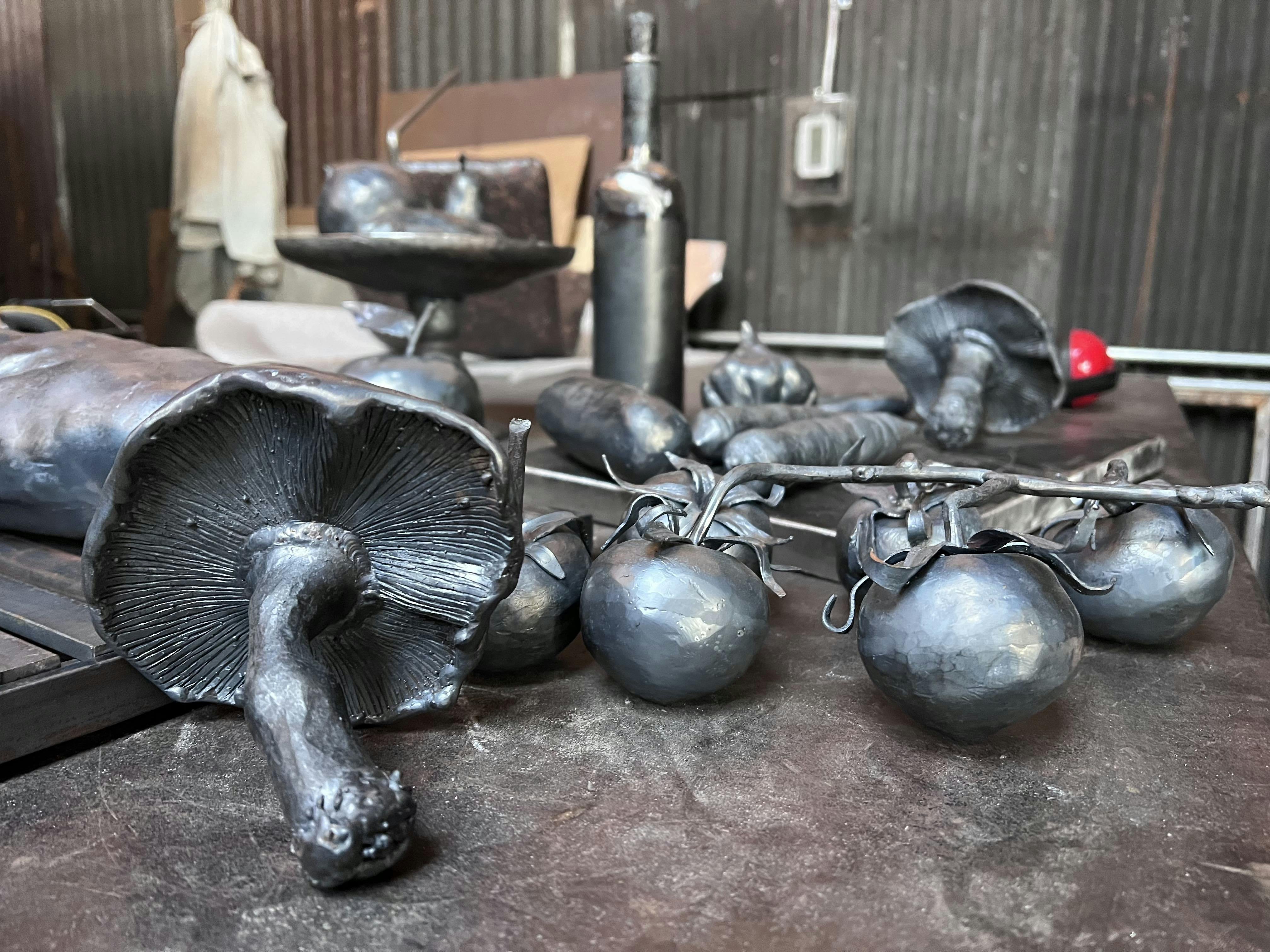 On a recent visit to The Steel Yard, D’Alessandro showed off her virtuosity with a forge and a blowtorch. Holding an abstract piece of metal with long-handled tongs, D’Alessandro expertly weaved between stations in the organization’s well-appointed blacksmith shop. Heating her medium to a red-hot temperature in a forge, she used handmade tools to vigorously shape and reshape the metal until it began to take the form of a croissant. It is a perfect addition to a collection that includes steel tomatoes, cucumbers, and an apple.