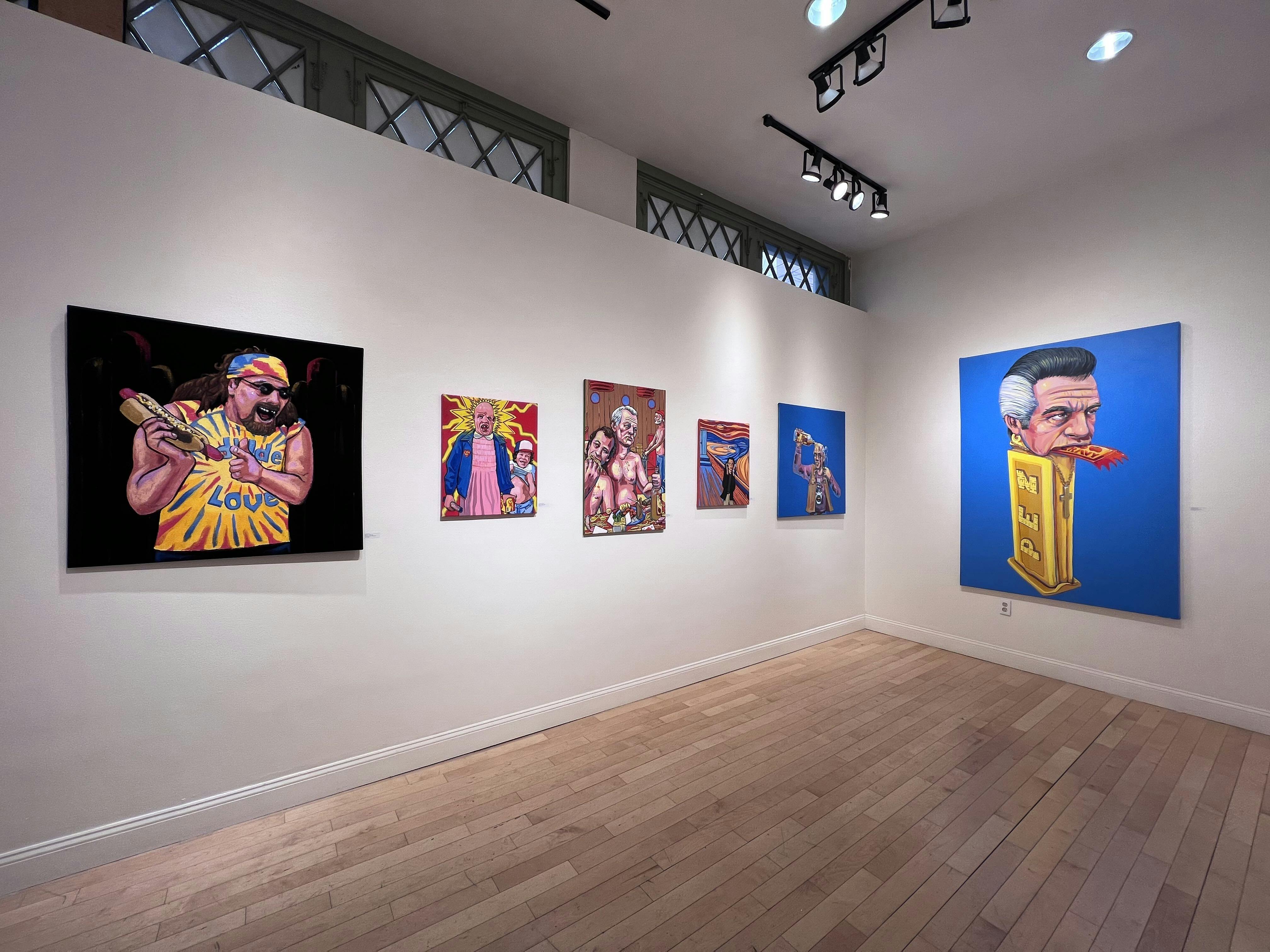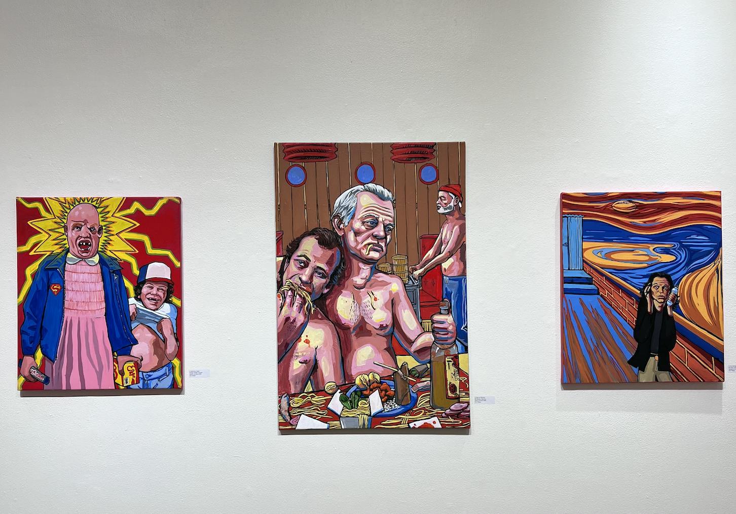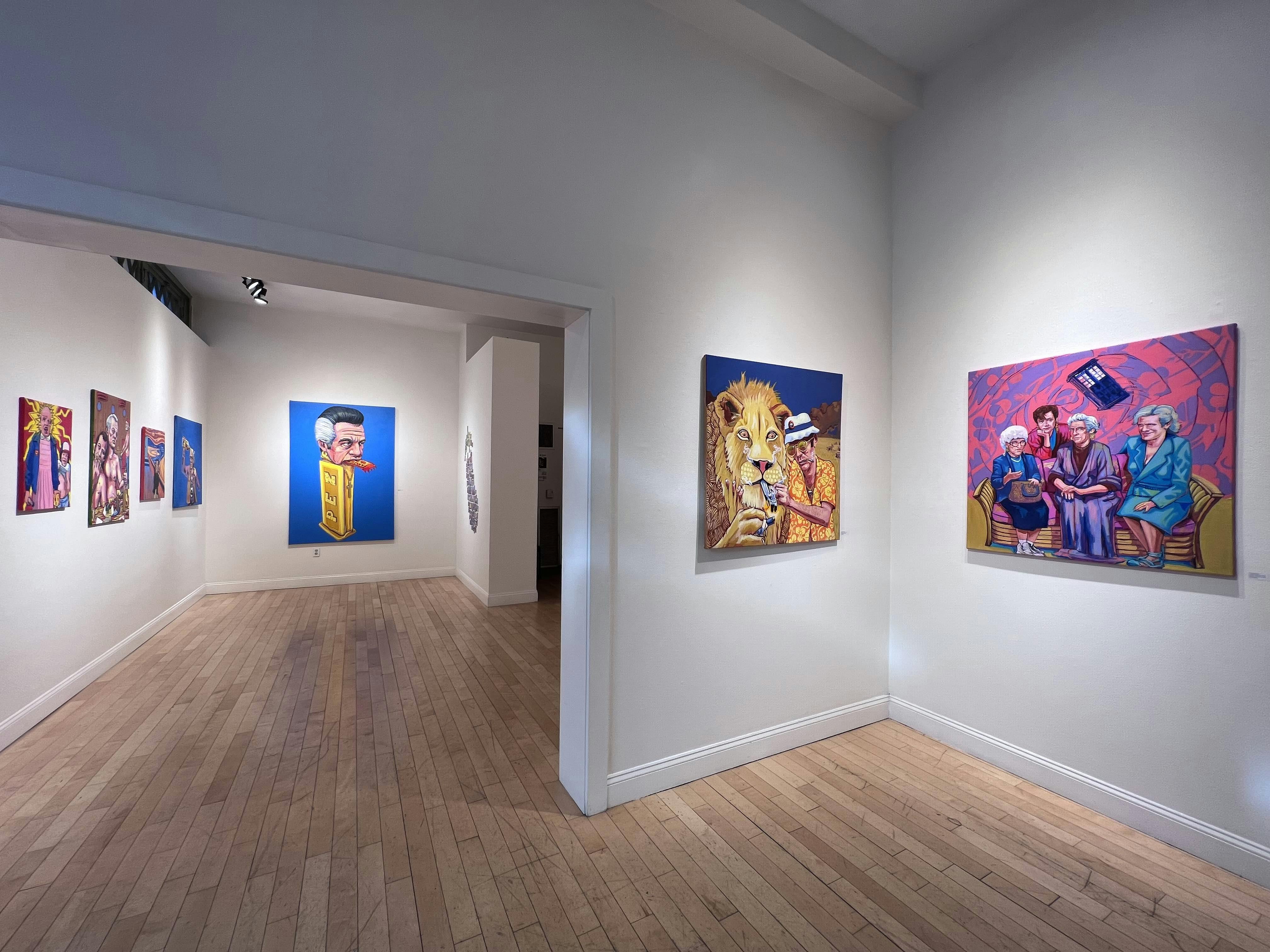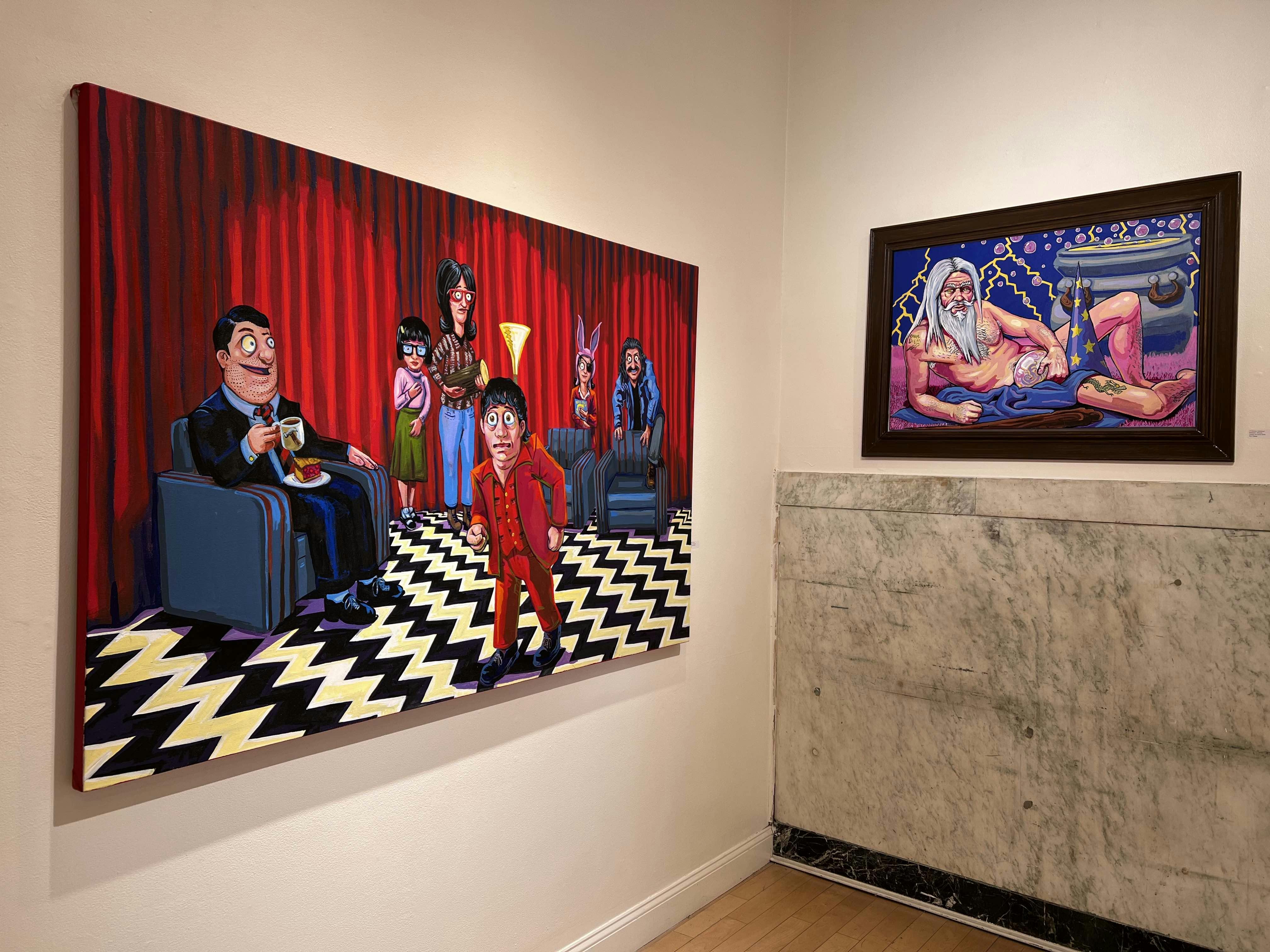 Two Thangs is the artistic brainchild of artist Matthew Brennan IV. Founded in Seattle in 2015, Brennan has since moved the project to Boston before relocating again to Providence in 2020. The basis of the works created by Two Thangs is conversation. Brennan joins forces with collaborators to meld two selected pop culture references into one cohesive work of art. In the paintings on view in the exhibition at AS220, a wry sense of humor comes across immediately. Topics range from Golden Girls and Doctor Who to a character from The Sopranos mashed up with a Pez Dispenser.