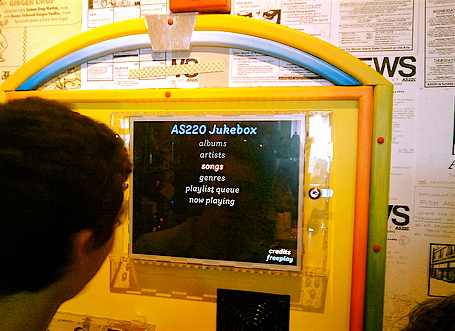 The entire jukebox was designed in-house, including the software, the design of the jukebox, and its manufacturing. Susan Clausen, Building Manager, all-around handy-person and artist, built out the installation of the jukebox into the bar’s wall. AS220 Labs’ Shawn Wallace provided the coin mechanism that one drops quarters into.