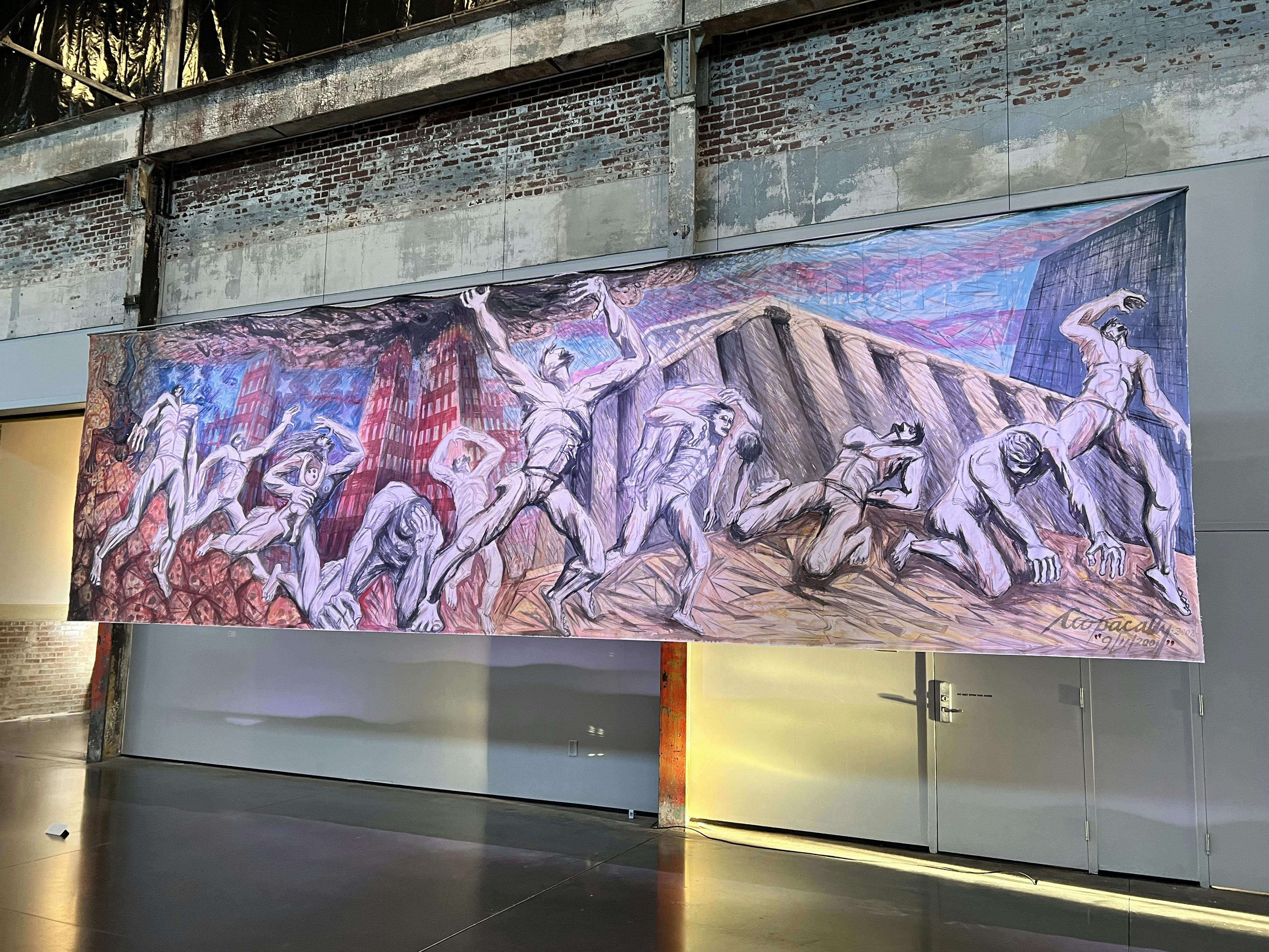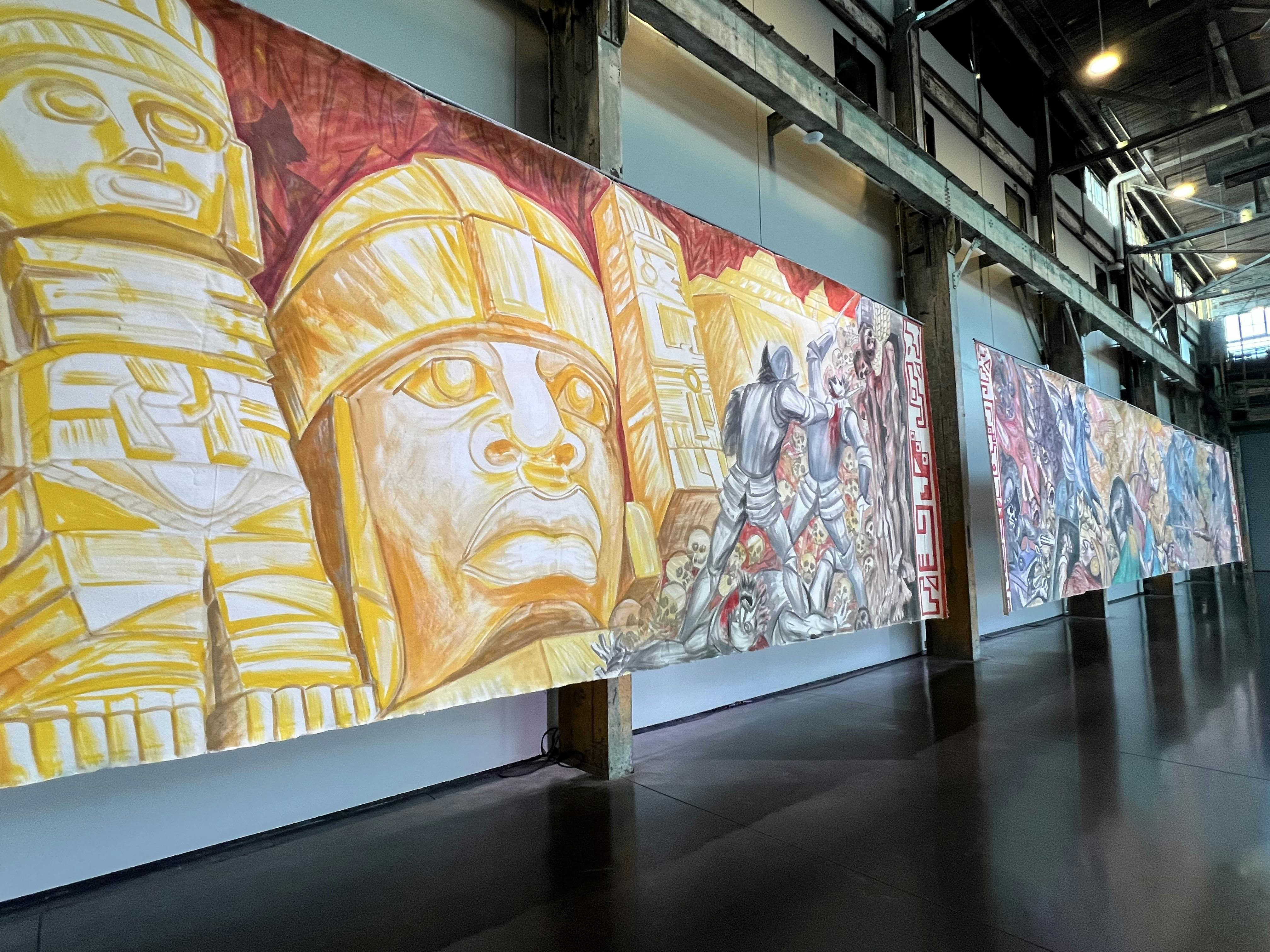 The exhibition at WaterFire, titled PACHA: Ancestral Evolutions, shows a series of seven murals that have never been seen together before. They cover topics ranging from colonization, to the Exxon Valdez oil spill, to the September 11th attacks, while centering the human experience. Asked what it means to him to share this body of work in the space, the artist points to the repetitions of themes throughout history, saying, "It's a phenomenal situation to show these murals at WaterFire. By painting these 7 murals I released the pain in my soul. I remember the repetition of history in these murals of Chernobyl; 9/11; Valdez oil spill; and the theme of genocide entitled ‘Invasion’, things still happening in different forms today."