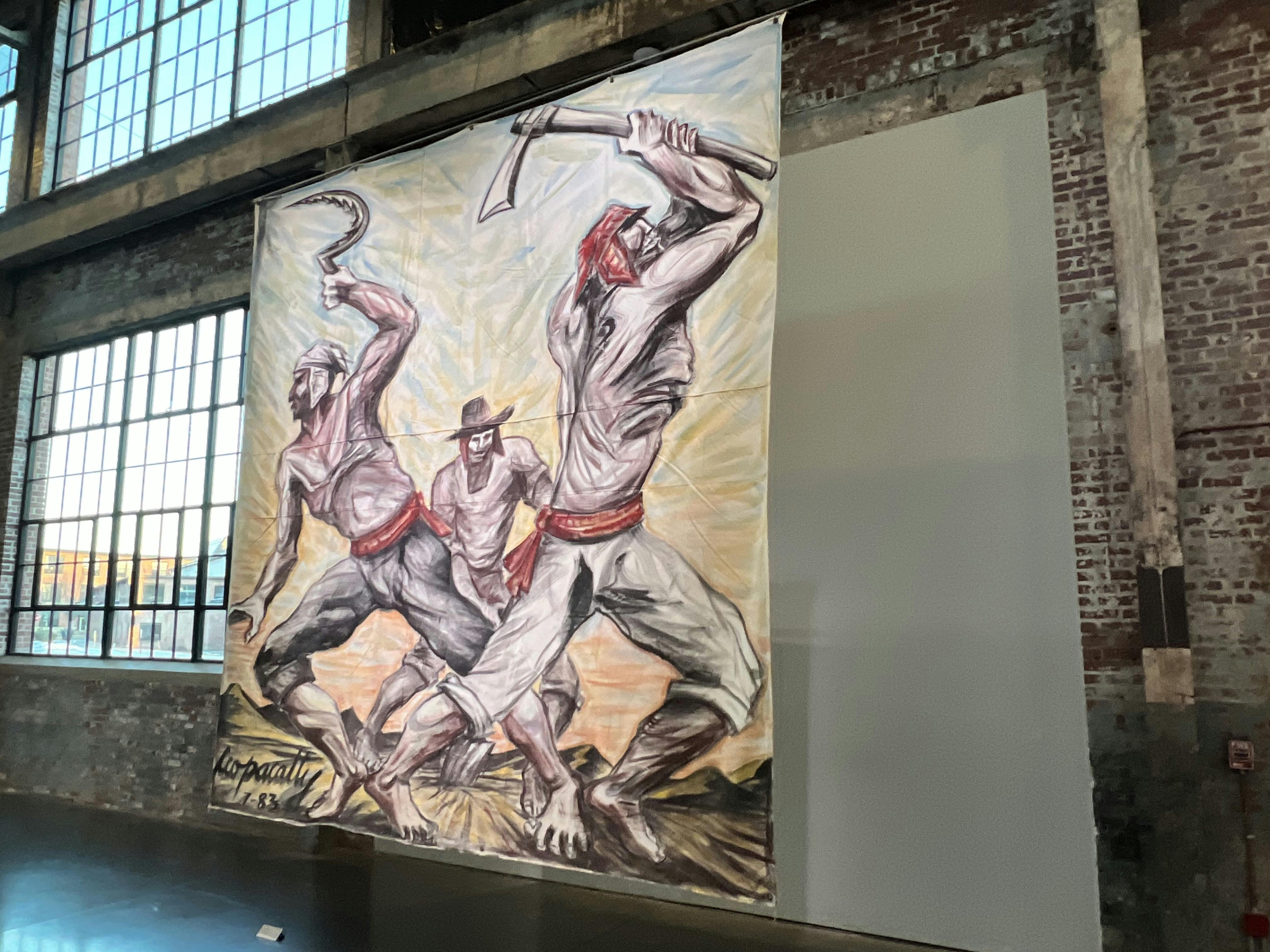 The murals on view are impressively scaled and are installed on wires away from the walls so that they sway gently as guests pass by them, making for a kind of passive interaction that is unusual in highly controlled exhibition spaces. Covering challenging subject matter, the human form is central to the compositions and Ccopacatty renders his figures in a way that is grand, expressive, and muscular. The pieces in the show exemplify the artists’ experience creating public artworks in various settings around the country and locally. He has collaborated with organizations like The Avenue Concept multiple times to put art with meaning in public spaces.