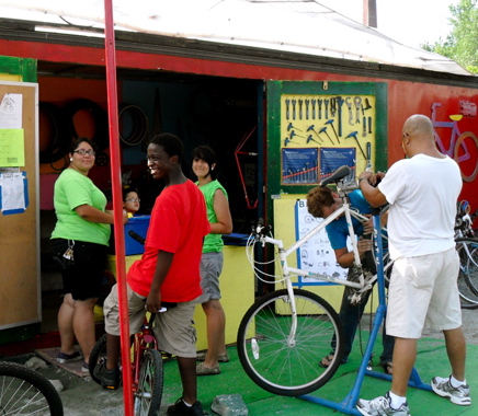 The shop started as a way for the Woonasquatucket River Watershed Council (WRWC) to promote use of the bike path and quickly grew to fill a need in the community for a bike center. Within three years, the shop has become a place where neighborhood youth repair and refurbish bikes for themselves and for resale at the shop. The unique seasonal bike shop is constructed out of two 40ft. shipping containers located at Riverside Park at 50 Aleppo Street in Providence, adjacent to the off-road paved portion of the bike path.