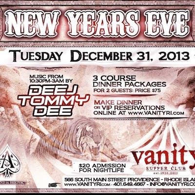 Join the folks at Vanity on Tuesday night for their New Year's extravaganza. They have dinner seating is available first come first serve from 5:00pm to 8:30pm. They are running a New Years Eve dinner pre-fixe for (2) for $75, which includes admission for the night and a delicious 3-course meal. From 10:00pm to 2:30am Vanity will have live music by resident DJ Tommy Dee. They will also have a countdown to midnight with confetti cannons and many surprises throughout the night. General admission tickets are $20. For more information visit their website.