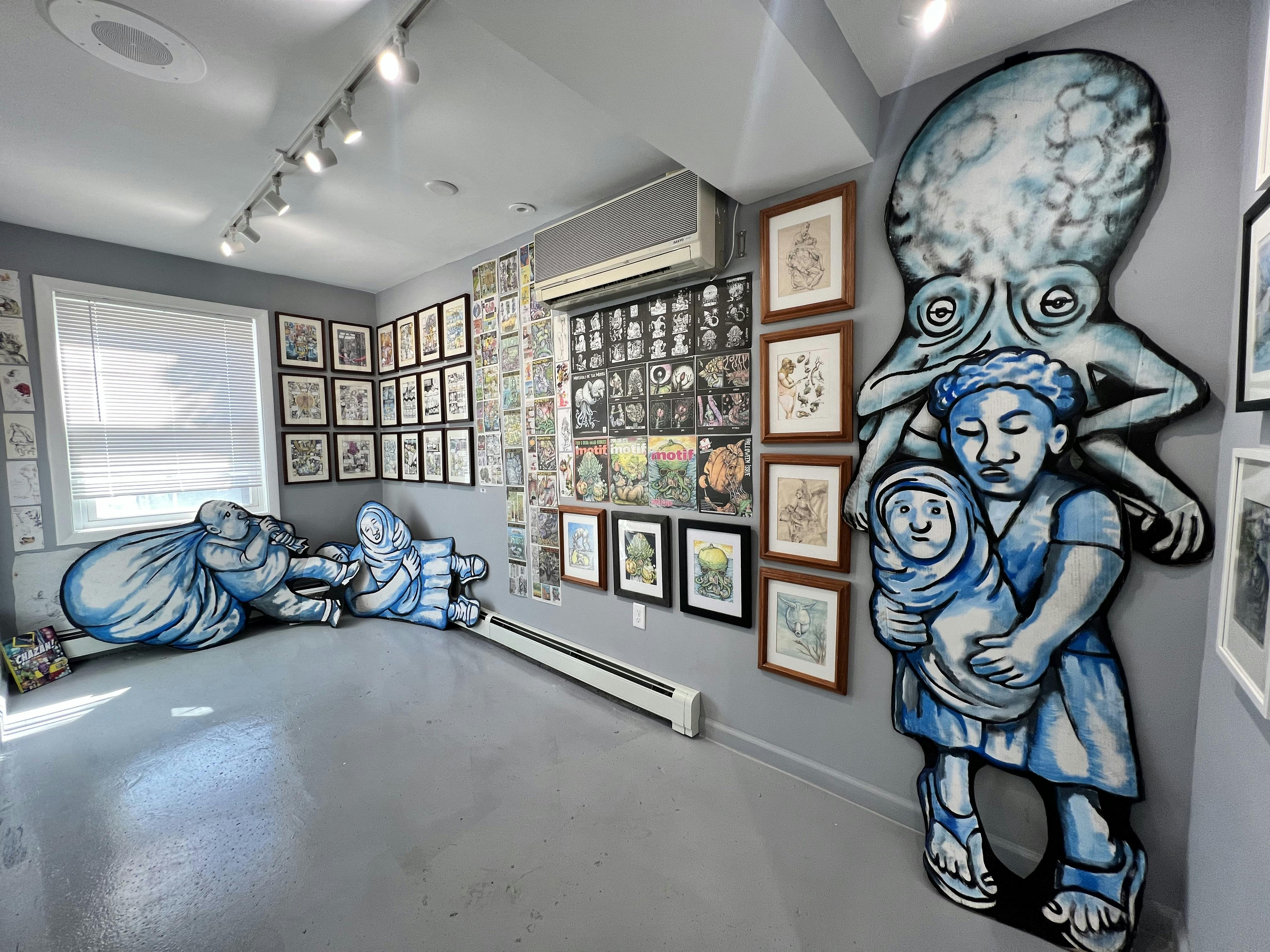 The immersive installation Pinque envisioned for this show exemplifies his maximalist sensibilities. Every surface is covered and every piece of paper is a potential canvas for his creativity. Repurposed envelopes from bills are the substrate for images doodled while he was on the phone. Comics and cartoons that he has published are pinned up as well. There are also original drawings for a graphic novel he produced for the late art patron Dr. Joseph Chazan about his career and collecting. Chazan and Pinque were longtime collaborators and the artist was the subject of one of NetWorks documentaries Chazan funded.
