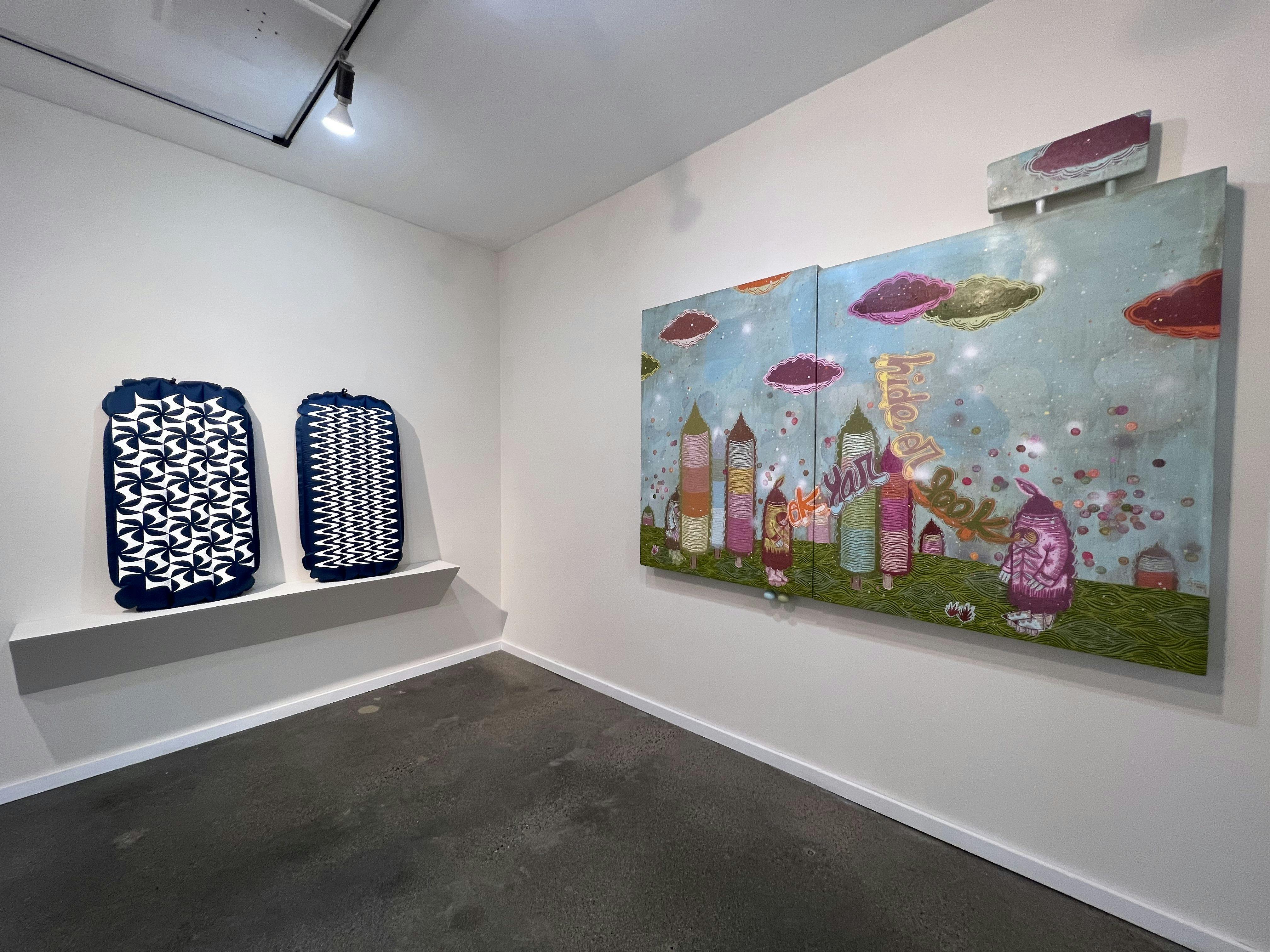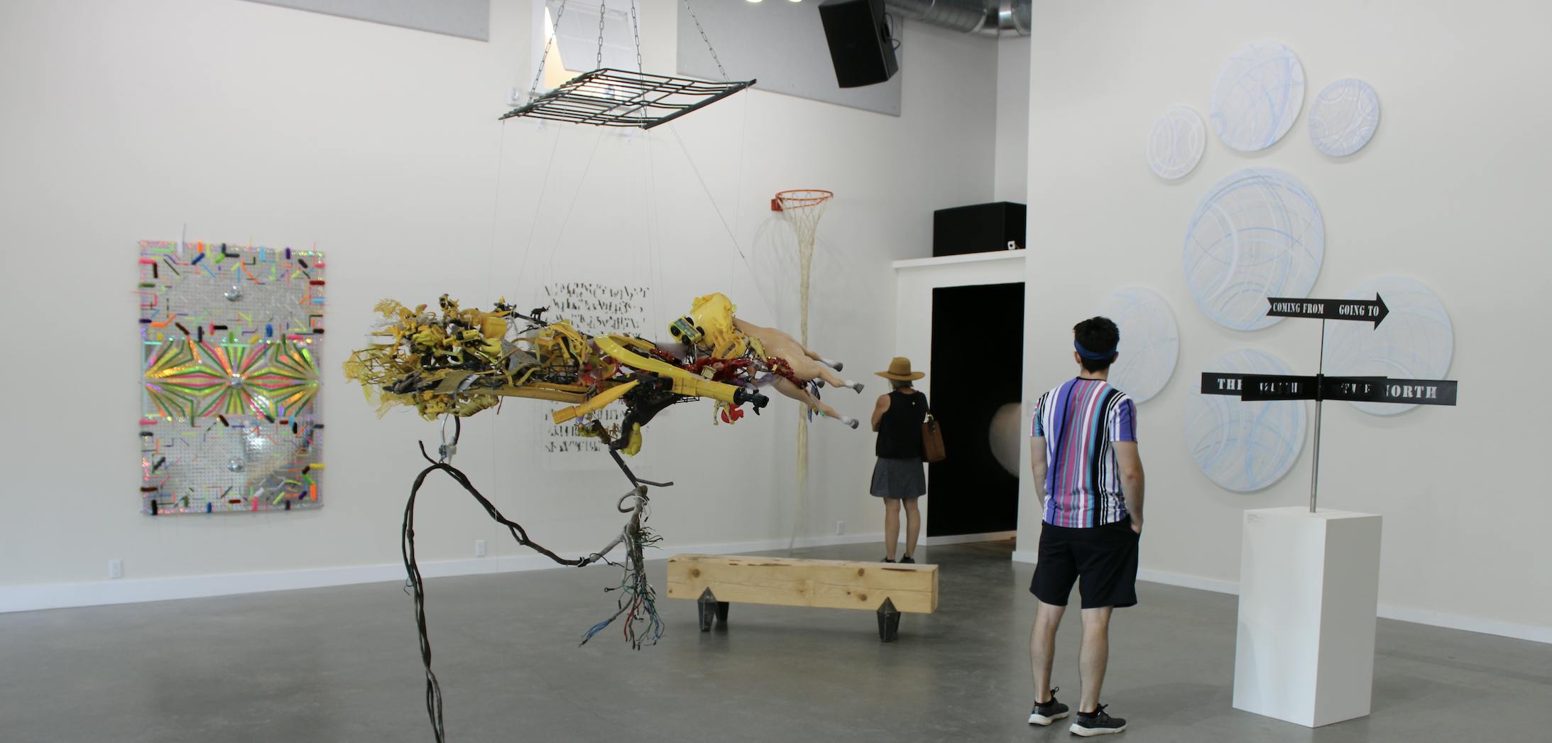Many of the pieces in the show utilize reused or found objects. Ara Peterson’s Untitled is a set of two stenciled air mattresses that leverage Op Art aesthetics in an unexpected way. Tom Deininger is exhibiting a sculpture fashioned entirely from detritus, mimicking a wall-mounted fish. Looking closely, one can find a bikini-clad doll in the sculpture’s mouth and a Virgin Mary near its eye.