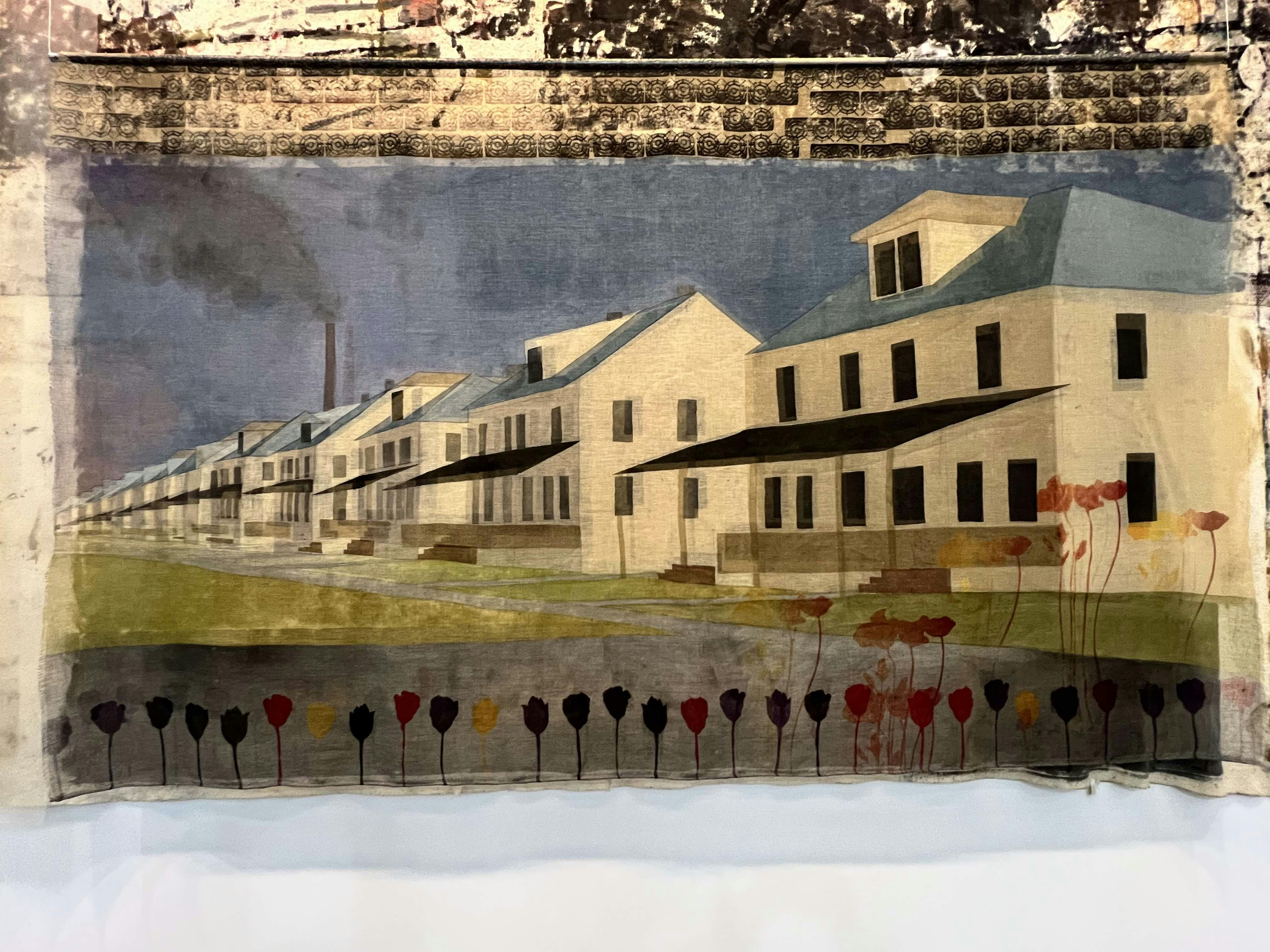 While much of the work in her exhibition in Jamestown focuses on figurative expression, one of the most impressive textiles on view is a vast and wall-spanning piece that illustrates company housing and the architectural impact of industry. The piece employs the diaphanous and multi-layered technique that has become a hallmark of Baronas’ production. Multiple panels of fabric are overlaid, creating effects of transparency, depth, and playful illusionism.