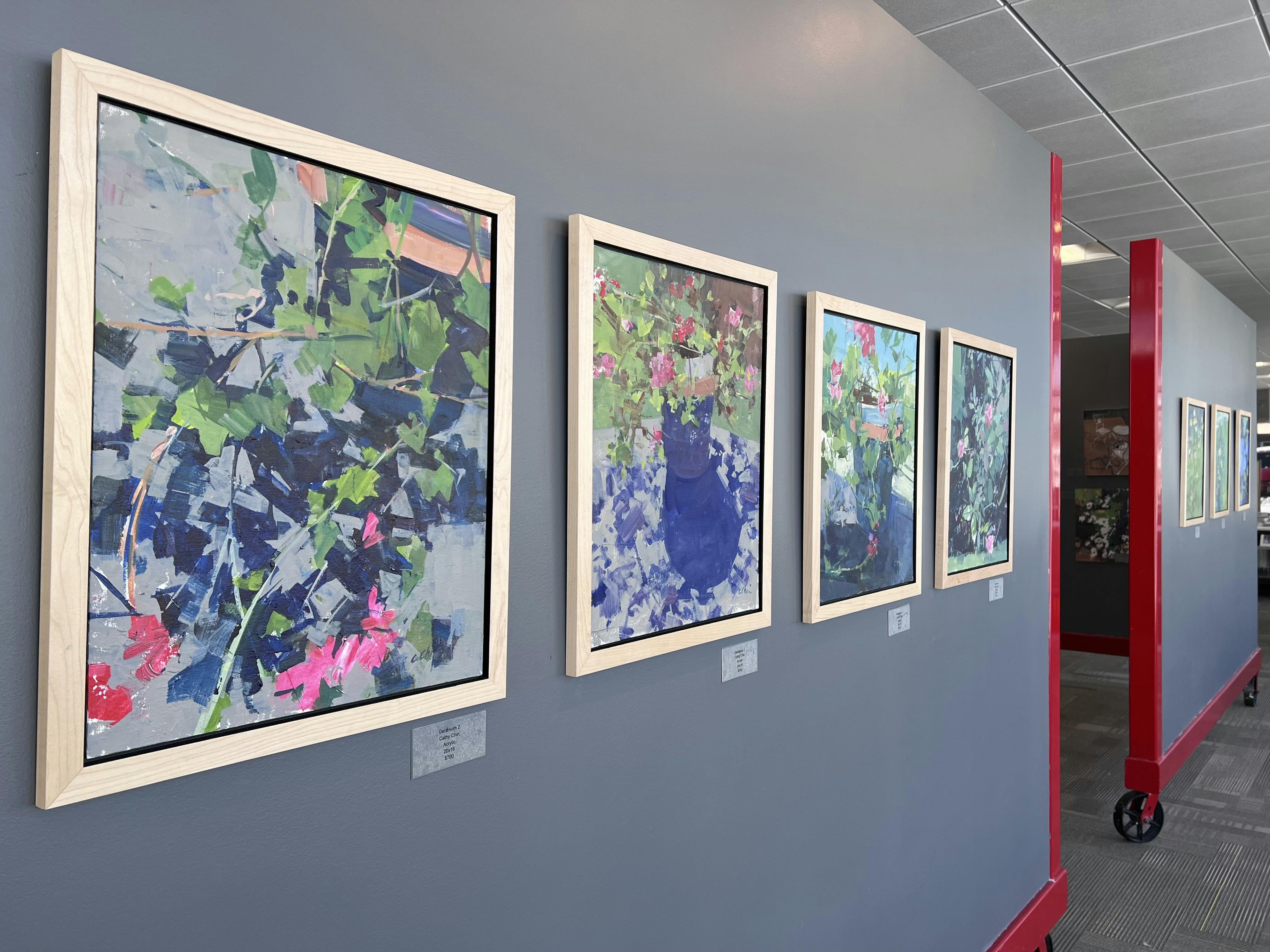 These qualities come across in all the paintings Chin displays in her Dryden Gallery exhibition. Her ability to convincingly construct a morning glory, or a rose, or the shady details of leafy undergrowth with just a few darting movements of her brush is exemplary. With equal levels of giddy paint application and refined restraint, Chin creates decisive snapshots of her world.