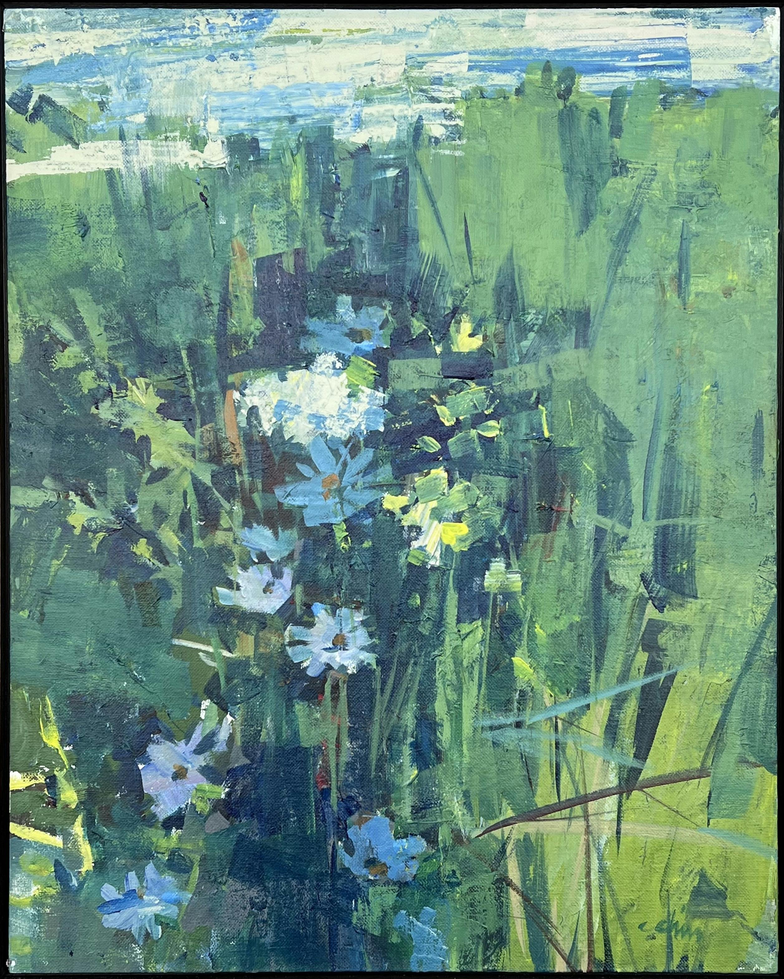 It is difficult to align Chin’s aesthetic with many other painters. Perhaps the closest corollary found in art history is Fairfield Porter, whose simplified representational style defied the orthodoxy of the popular Abstract Expressionist movement. Like Porter, Chin often leverages a less saturated palette in order to shift viewers’ focus to mark, form, and construction. Reflecting on her painting style, Chin says, “The energy from gesture and brushstrokes is what I am after. I draw with shapes.”