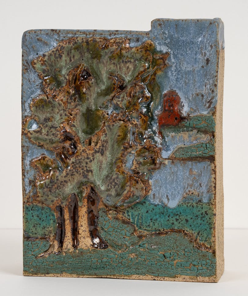 Also enjoyable, Jolie Stahl’s ceramic work leverages the earthy medium of clay to explore nature. In “Landscape with Tree”, the craggy limbs of a tree blend into the rich blue expanse of sea and sky. Stahl’s surfaces and glazes result in warm and inviting scenes that make inventive use of ceramic. Stahl boasts a lengthy resume of awards and exhibitions, beginning with studies at the School of the Museum of Fine Arts.