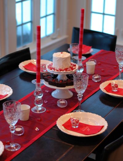 Set the Table - If you have a plain white table cloth use that and sprinkle red M&M candies or candy hearts on your table to make it festive. As a centerpiece, buy some flowers at your supermarket (they are great!), cut them to a height where they’ll spread out loosely in a wide mouthed vase. Add red and/or white candles (Pier One has a great selection and a few great ones on sale plus some really sweet Valentine’s decorations), plain white plates and you are done. Too easy, right?