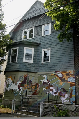 It's the next mural by Lydia Stein in the HousEART Project. Smith Hill Community Development Corporation (SHCDC) Project Manager, Christian Calderone began HousEART in an effort to "bring life and color" to the neighborhood. HousEART is a community art movement, where housing associations and local artists teamed up to paint murals over the vacant homes that lined the neighborhood streets. SHCDC has recently purchased 24 closed or vacant Smith Hill properties, which they plan to restore and rent/sell at affordable prices. The HousEART project is a great opportunity for artists to transform rundown neighborhoods into art exhibits while they wait to be renovated.