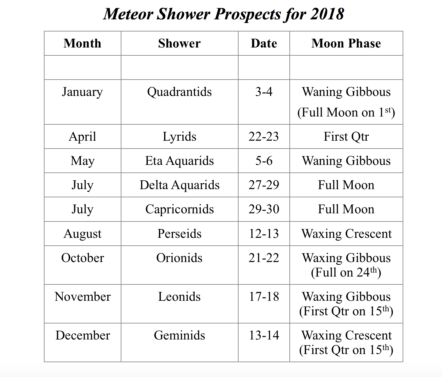 The schedule of the other major meteor showers for 2018 appears in a table at the end of this column.