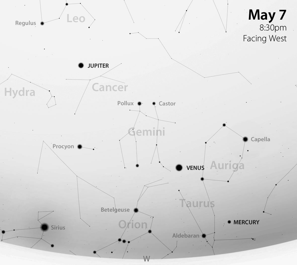 During the first few weeks of May you can catch a naked-eye view of Mercury. On May 1, if you have an unobstructed view towards the west-northwest, you will find our solar system’s closest planet to the Sun about ten degrees (a fist held at arm’s length provides this measurement) above the horizon after sunset. It will be just less than two degrees to the left of the Pleiades star cluster (Subaru symbol), and just about ten degrees to the right of the V-shaped Hyades cluster that forms the face of Taurus the Bull.