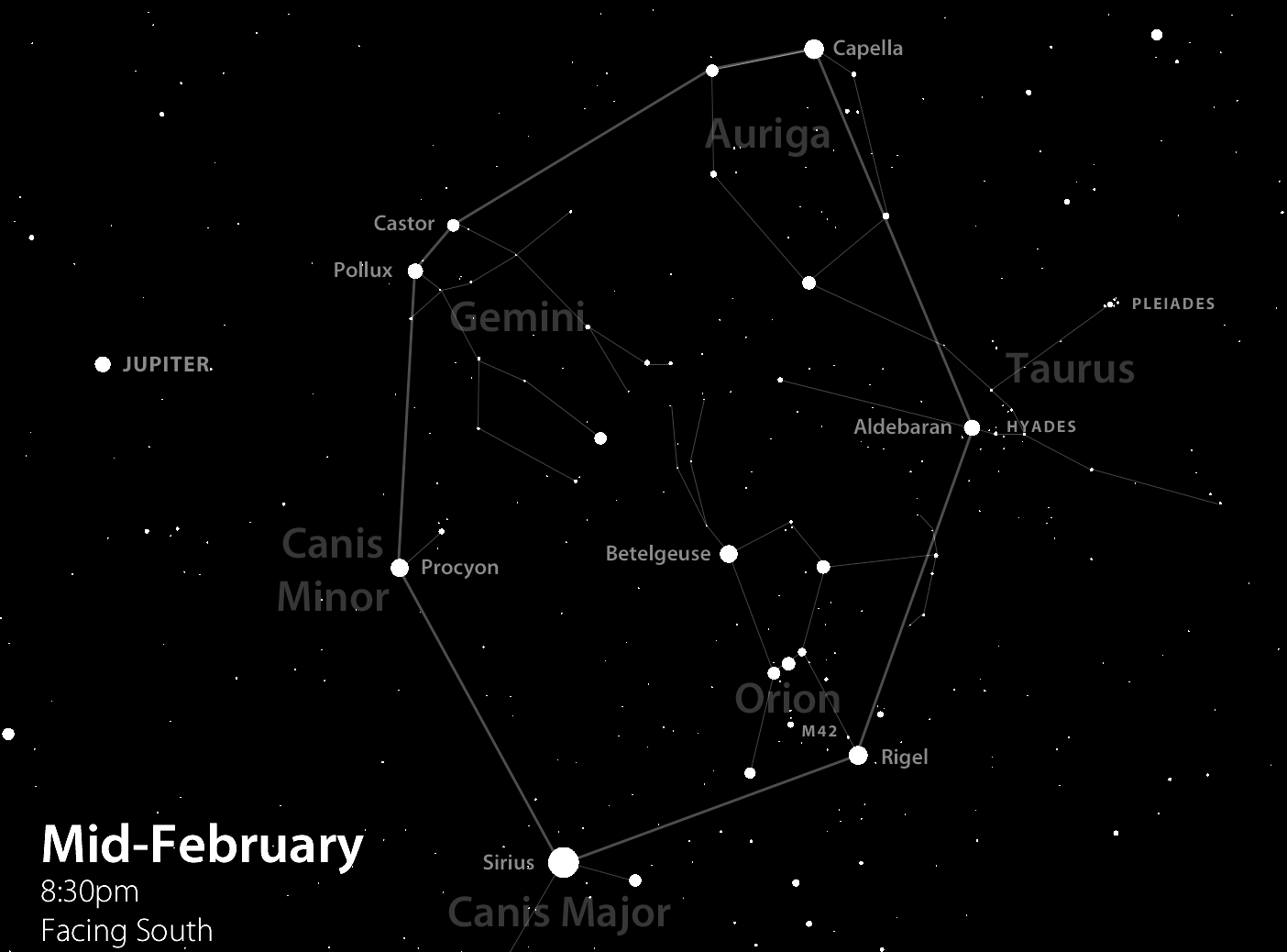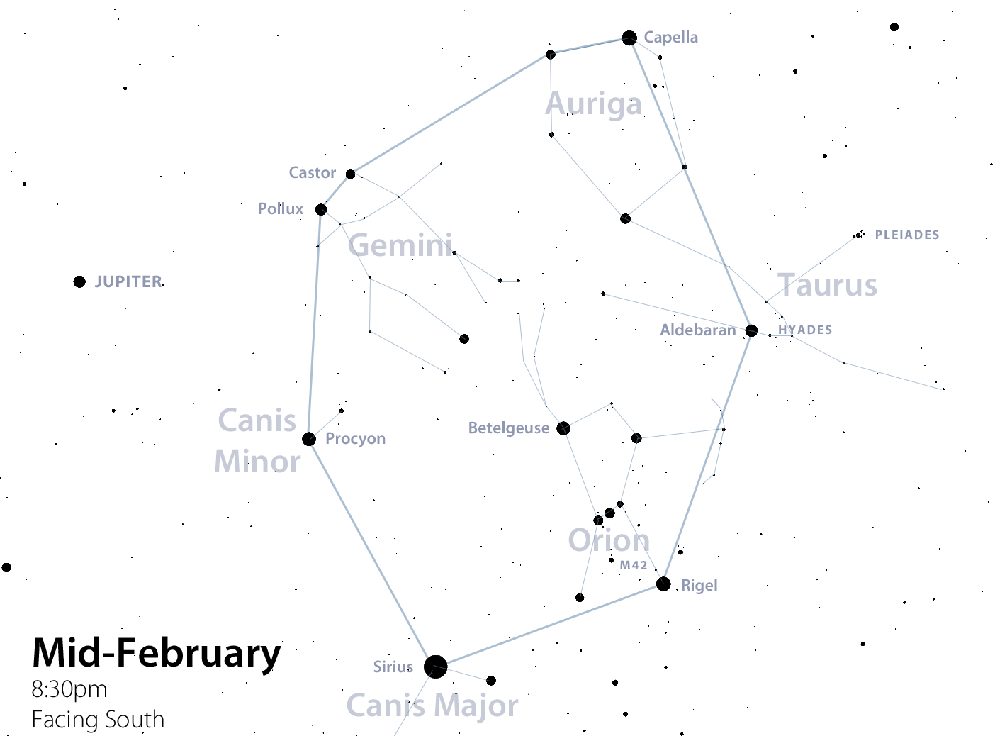 Please examine the basic star map accompanying this article. This chart represents the sky in mid-February at 8:p.m. , looking from a point directly overhead towards the southern horizon. A circle, or actually an ellipse, can be drawn through each of the labeled stars. However, you can also draw a straight line from one star to the next and create a hexagon. Betelgeuse, though inside either pattern, is still considered part of the asterism.