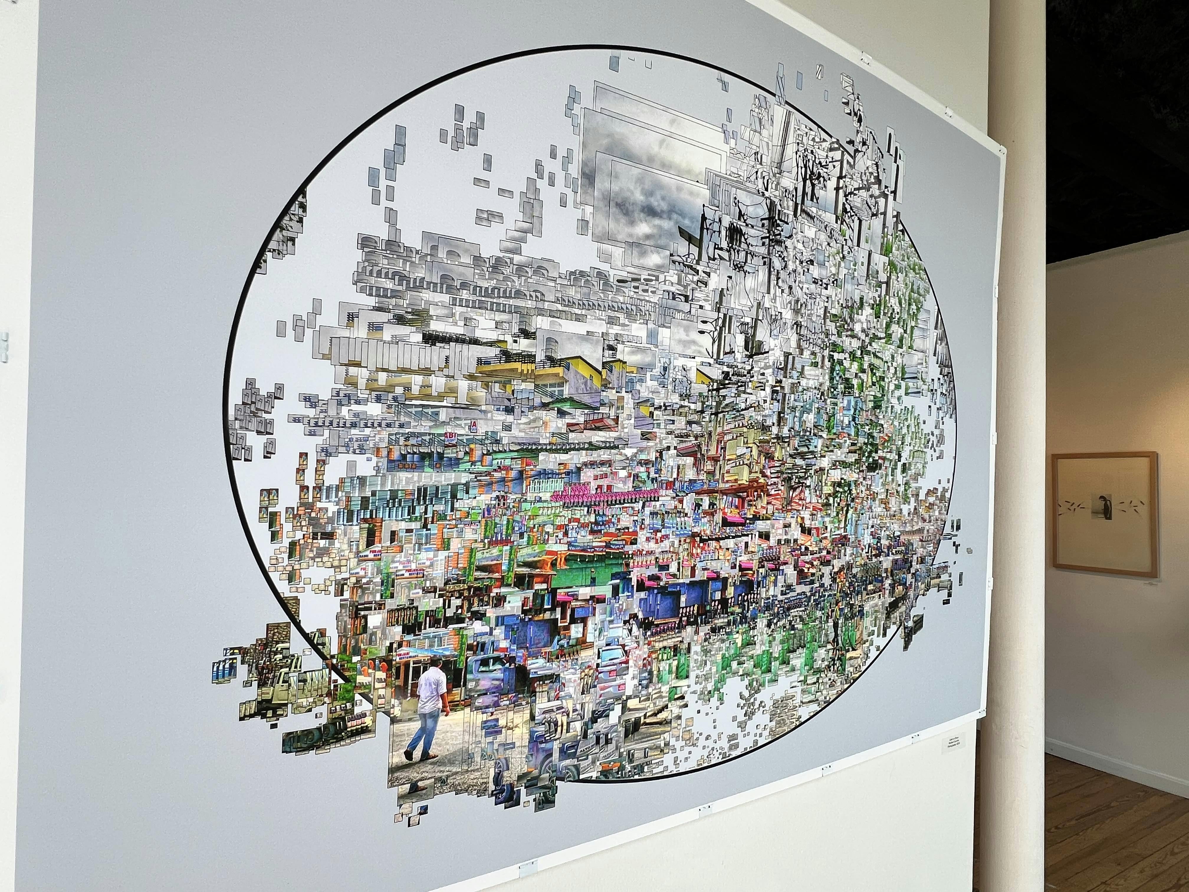 While the prizewinners won the praise of the juror, there is plenty of interesting work to see in the show. In the front of Imago’s storefront gallery, a large photographic collage by Michael Guertin probes boundaries very directly. In the image, a circular border struggles to contain disintegrating photographic details with figures and architectural details showing up for the keen observer. The graphic border is overrun by sometimes tiny pixels escaping.