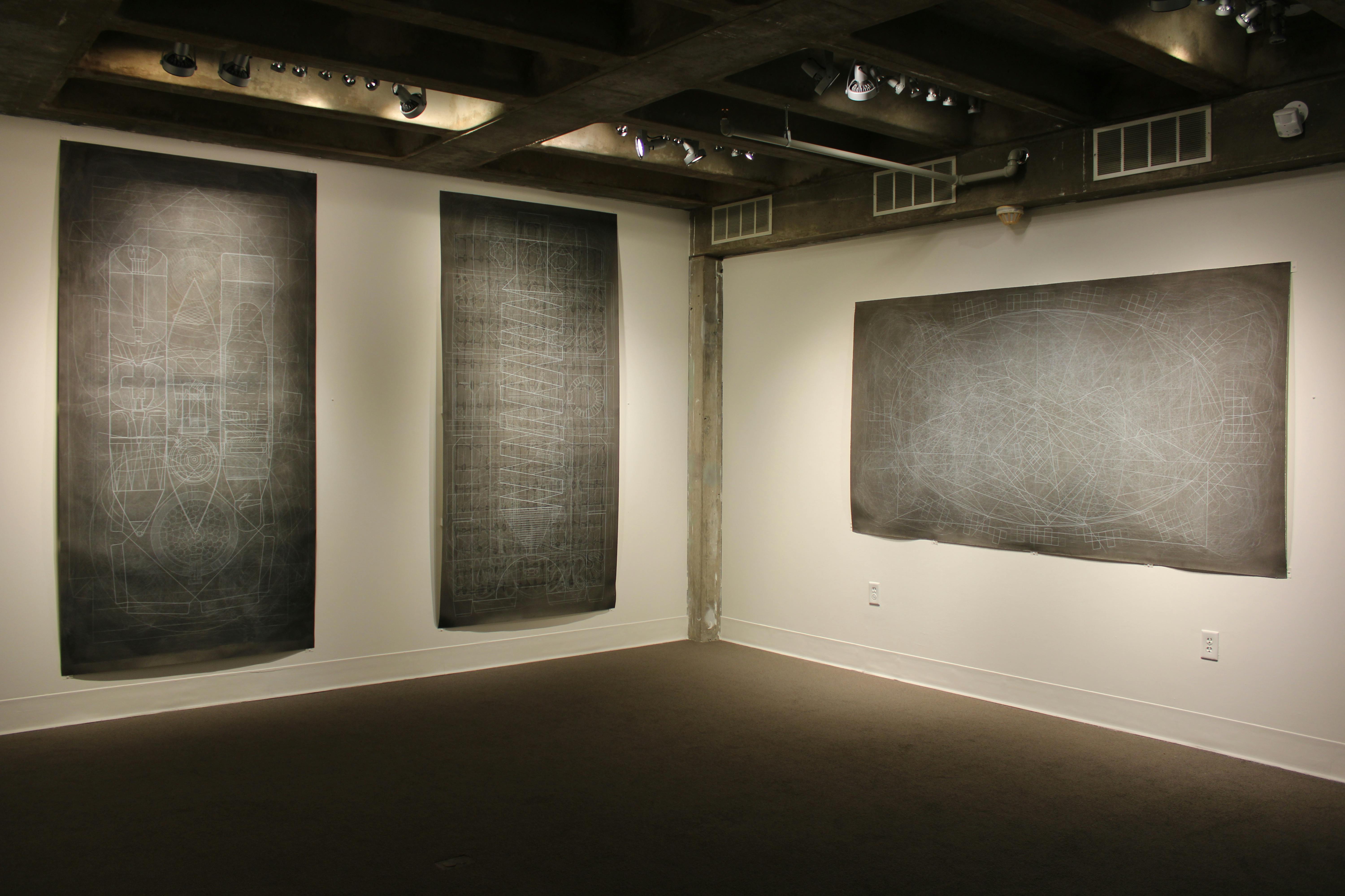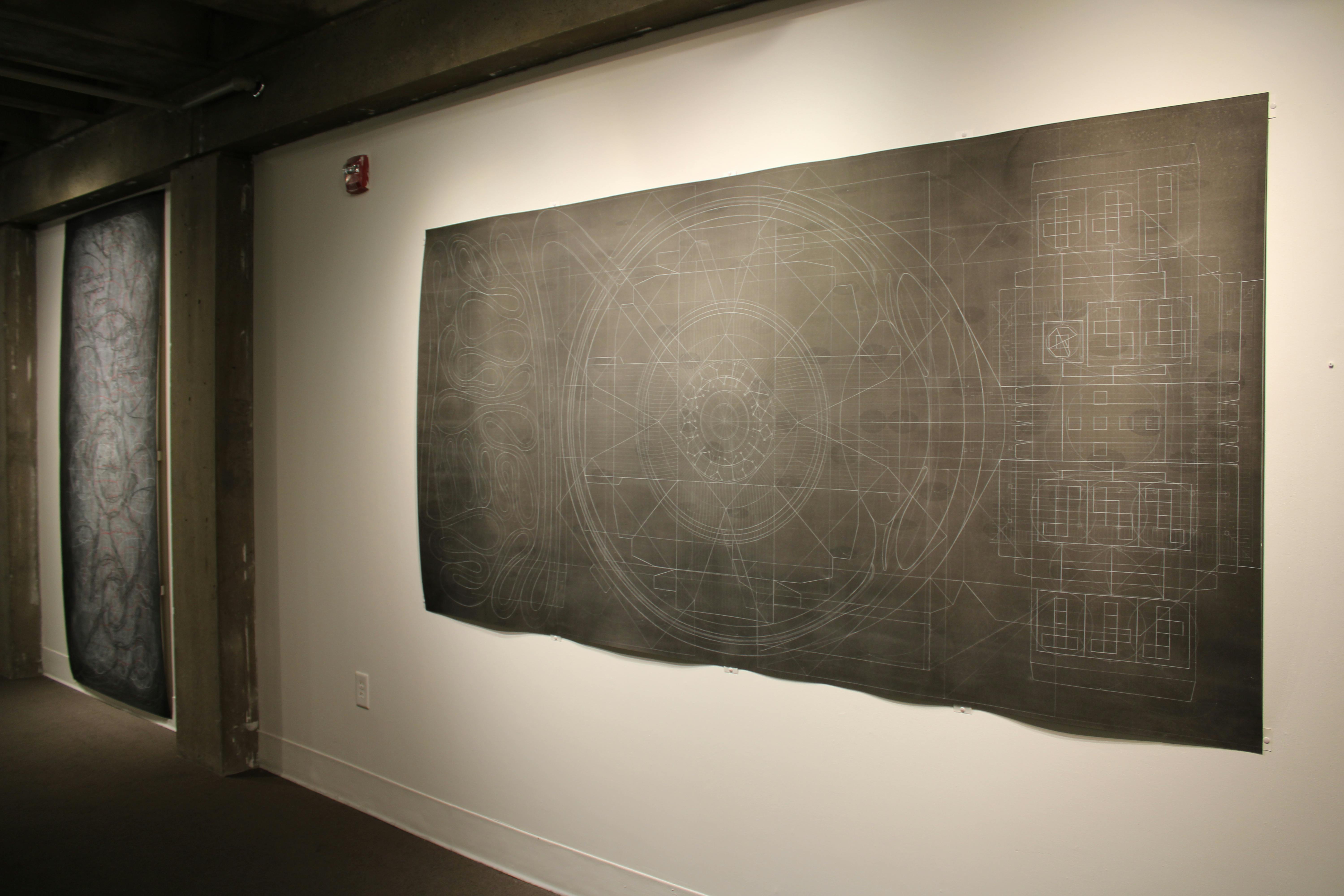 Horii’s deeply layered drawings overlap varying forms of diagrammatic imagery. The typical static found in technical or architectural schematics is flouted in Horii’s artworks, which are presented on paper that subtly puckers and waves. In Horii’s wall-length drawings, the trustworthy vocabulary of a blueprint is often subverted, making for enticing opportunities to reexamine ideas about how to read an image.