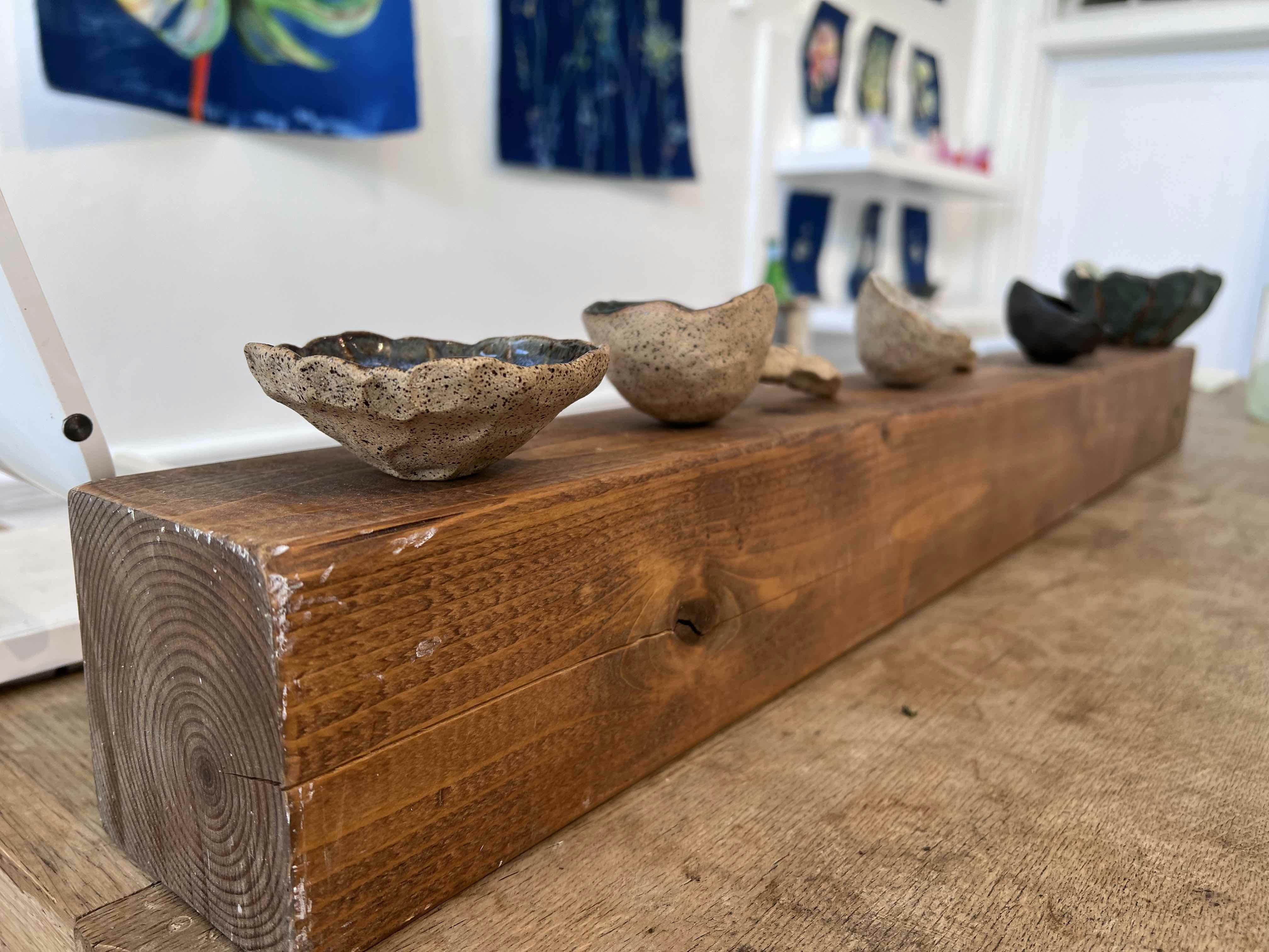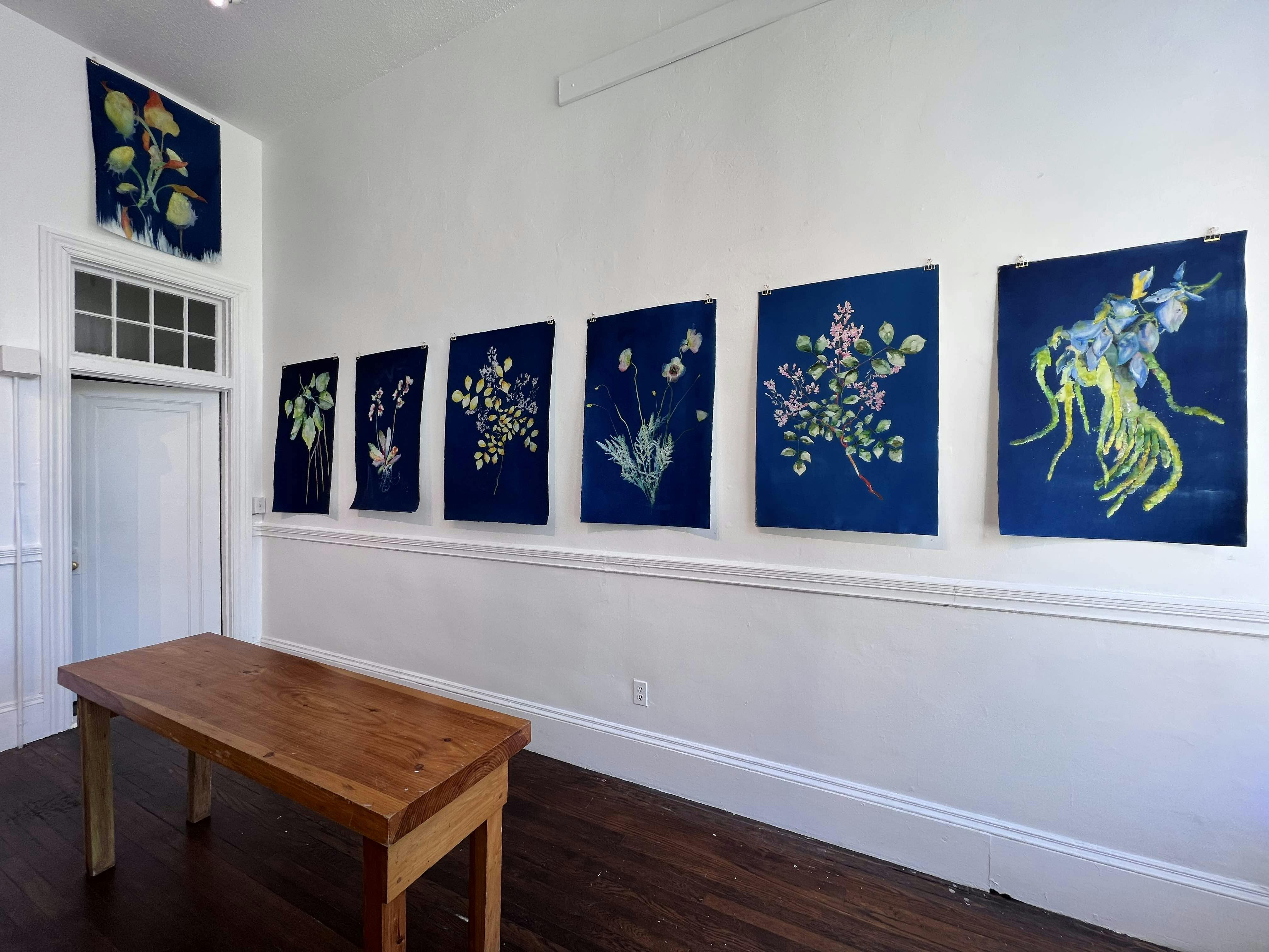 When asked about the connections between her work and her co-exhibitors, cyanotype artist Windham is enthusiastic. She says, “For this exhibition, Willa and I conjured up the idea of roots to blooms, encompassing the earth and the plant and the sky. Tammy Kim’s worked earthenware is so connected to the ground and the soil, and growing is an essential part of her practice as an herbalist. Pierre Bowring’s effortless glass vessels echo my use of watercolor and remain so full of air and light. There is a real connection among us.”