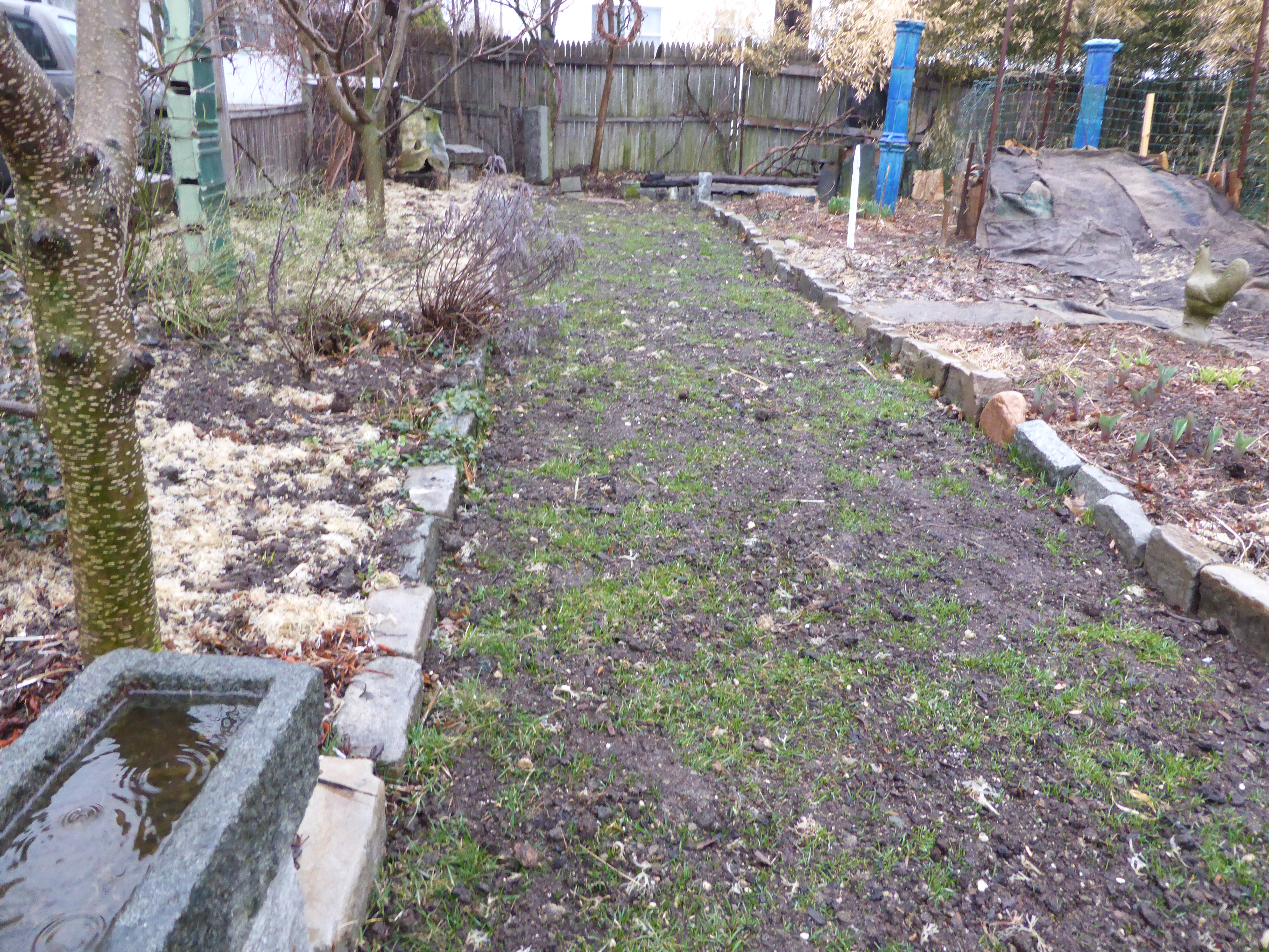 I cover the old turf with an inch or two of compost, just enough to obscure winter’s surviving, greening growth. Rake out lumps with a hard landscape rake but not obsessively or over wrought. Hand tools are a joy and feel the rake between your fingers and hands, (wear gloves!), get comfortable with your tools. Always lay down rakes off passageways with the tines facing the earth. Somewhere is a rule that rakes are stepped upon, often the innocent and unwary, frequently by forgetful gardeners. A handle suddenly leveraged into the nose is a seasonal reminder to be thoughtful, gardening is a thinking person’s game. Pay attention, please. A throbbing nose or black eye is not required for successful gardening.
