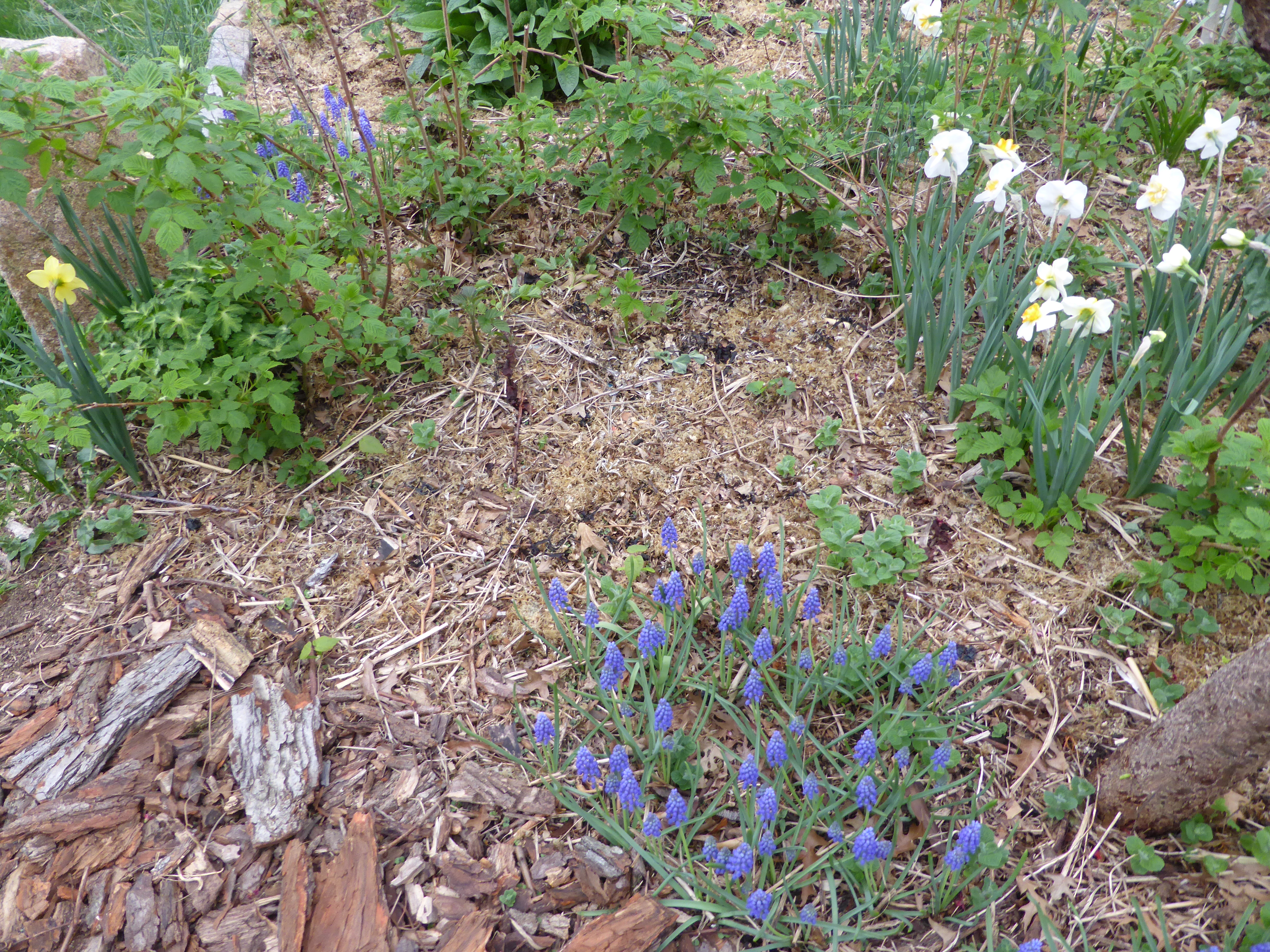 Perhaps you have Muscari, the grape hyacinth. Originally, like most of my spring flowering corms, bulbs and tubers, they were planted on the margins, the places on the edge. Yes, all aspects of the needs for best lives are present, sunshine, well-drained soil and plenty of humus under the mulch. Scatter bulbs with a single gestural arm sweep for random appearances. Plant a little deeper than the package recommends. I firmly believe a generous smidgeon of bone meal buried with bulbs makes for healthy blooming plants. Mine multiply. A lovely blue haze of Muscari lives happily under dwarf apricots and dwarf pears. One or two are outliers, probably noticed by a gardener whose tricky back allows periods of kneeling and bending before the memo arrives: no more. Despite vigilance, I often find an overlooked bulb or two; hastily push into the soil and cover. Such are the beginnings of migrations throughout the garden. Grape hyacinths, scilla, and snowdrops expand into new territory more pleasing to the eye than Sunday afternoon.