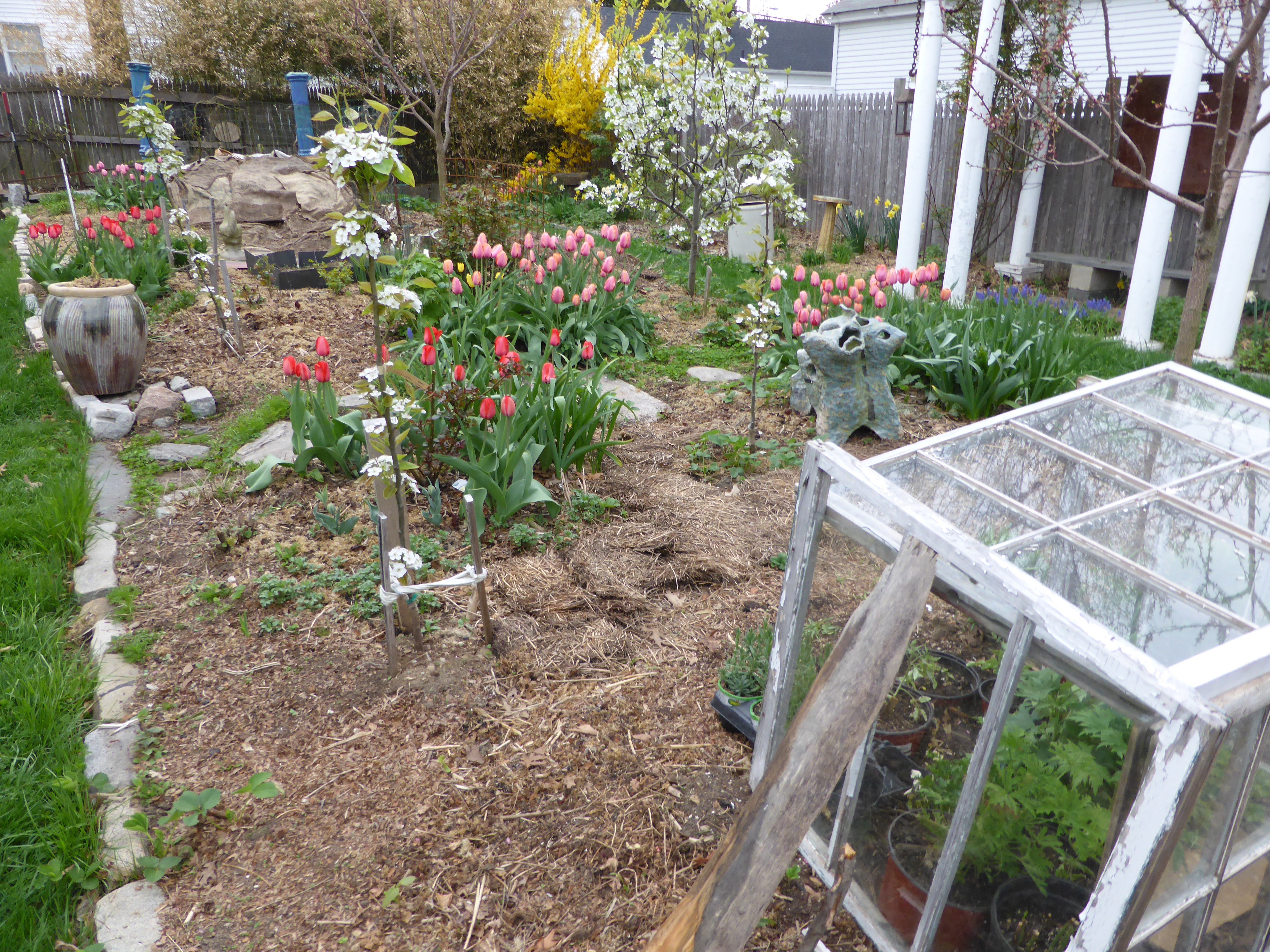 Peach blossoms are drifting downward into the planting beds and scatter pink petals on mulches and emergent daylilies. Hummingbirds are showing up looking for bright colored flowers. Empty pots are hungry for soil and trays of annuals are kept moist in semi-shade before planting. I mix potting soil in a wheelbarrow: a quarter peat moss, a quarter perlite, and a half measure of compost and topsoil, harrow with a hoe and fill empty pots stored year to year under shelter. My practice is to empty the pots each fall right into the central garden and winter over upside down. Pots kept in this fashion endure for many years, usually casualties of clumsy gardeners and not frozen, expansive soil and water.