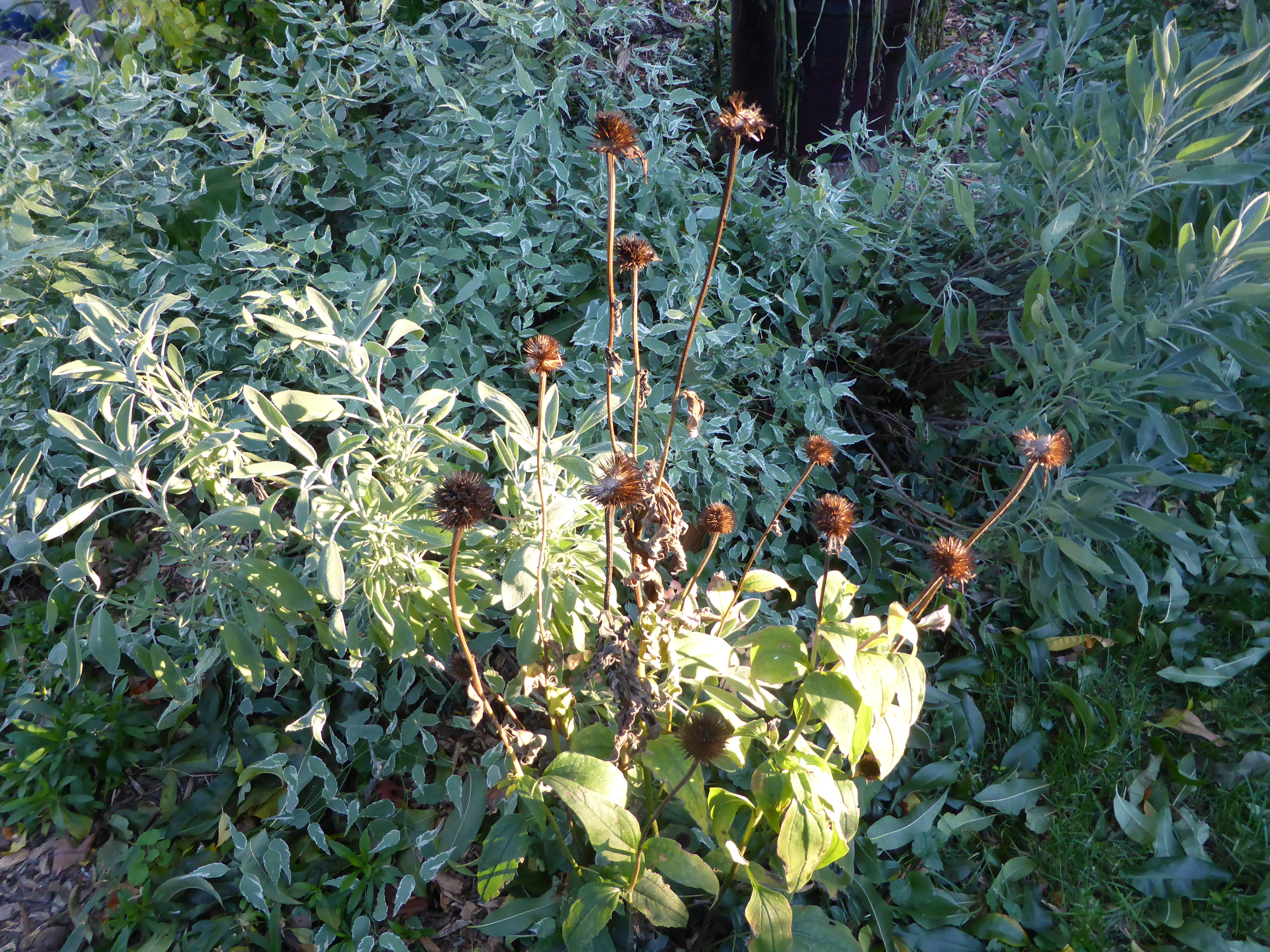 The gold finches have just about finished off the coneflower delightfully geometric seed pods. Some were brought in earlier and hung to dry. Cool weather draws the best out of us. Cut back the coneflowers level to the mulch. Lift and divide thick grown clumps into larger spaces, encourage those you prefer with less competition into a trowel’s depth site, mix in bone meal and compost and replant. Exchange extras or various colors of coneflowers either as transplants or seed among friends. There is much pleasure in putting the garden to bed. Other perennials are hardening off from frost. Guide their retreat into dormancy and tuck thick grown or precious few into new homes.