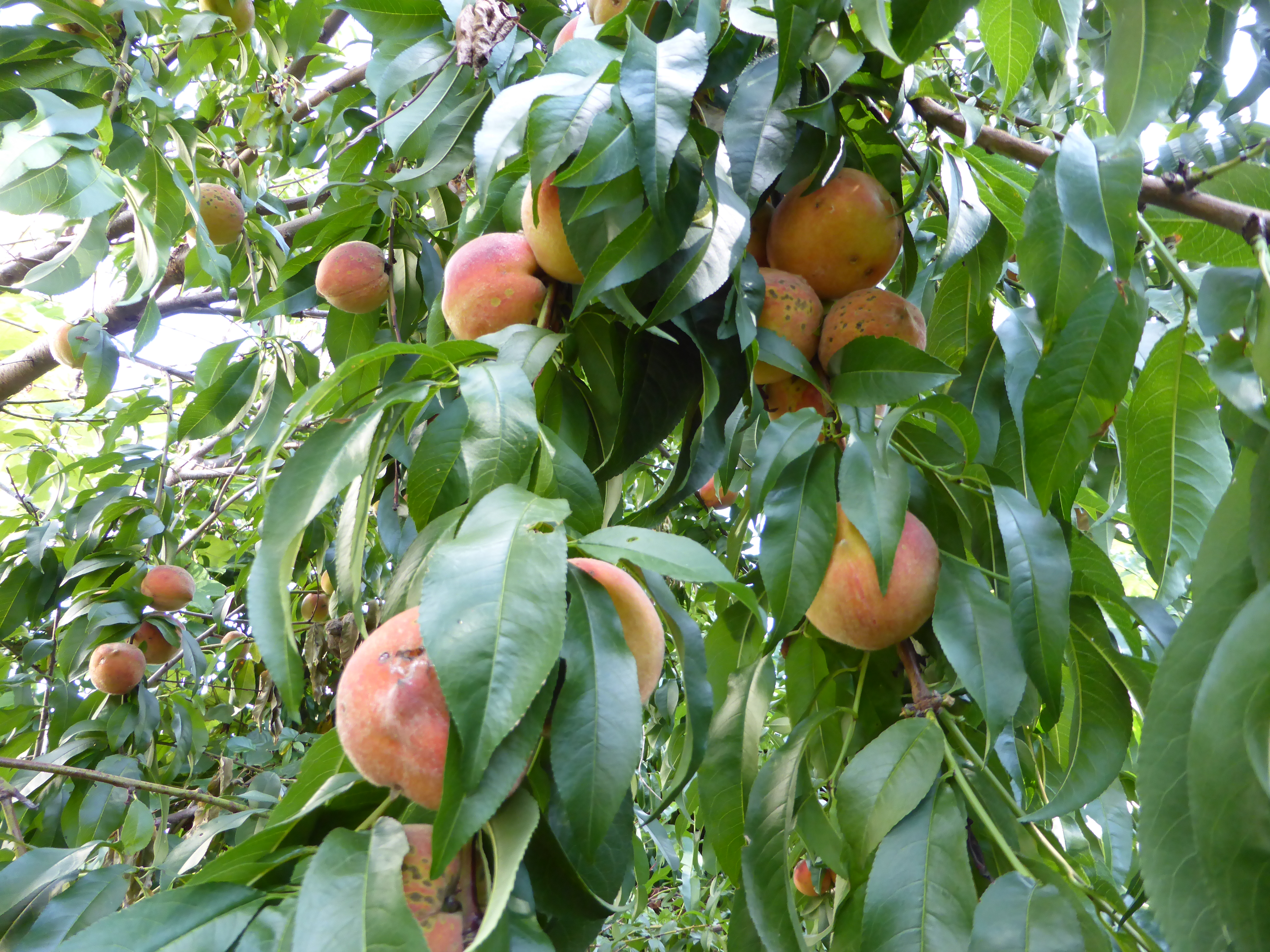Spray in the winter with dormant oils, vegetable oil and water works fine, copper sulfate preparations mixed with oil and sprayed over the tree are easy to apply during cold weather, I renew once or twice to replace as washed away by rain and melting snow. Molds, fungi and insect eggs need oxygen to survive, the oils quietly smother wind-blown spores and parasites. Your off season efforts are plainly evident during the growing season fruit trees virtually free of infestation. Gardeners tolerate, indeed embrace a spot or two that would never make it to the produce section. I make every effort to remove “mummies” or infested fruit but a few always seem just out of reach. Nature shakes loose weaklings, gardeners must gather courage and thin for larger fruits and lighten the heavily weighted branches. Some will break. Prune back, I duct tape over the worst wounds especially when strips of bark peel back from the break. Taped, they heal.