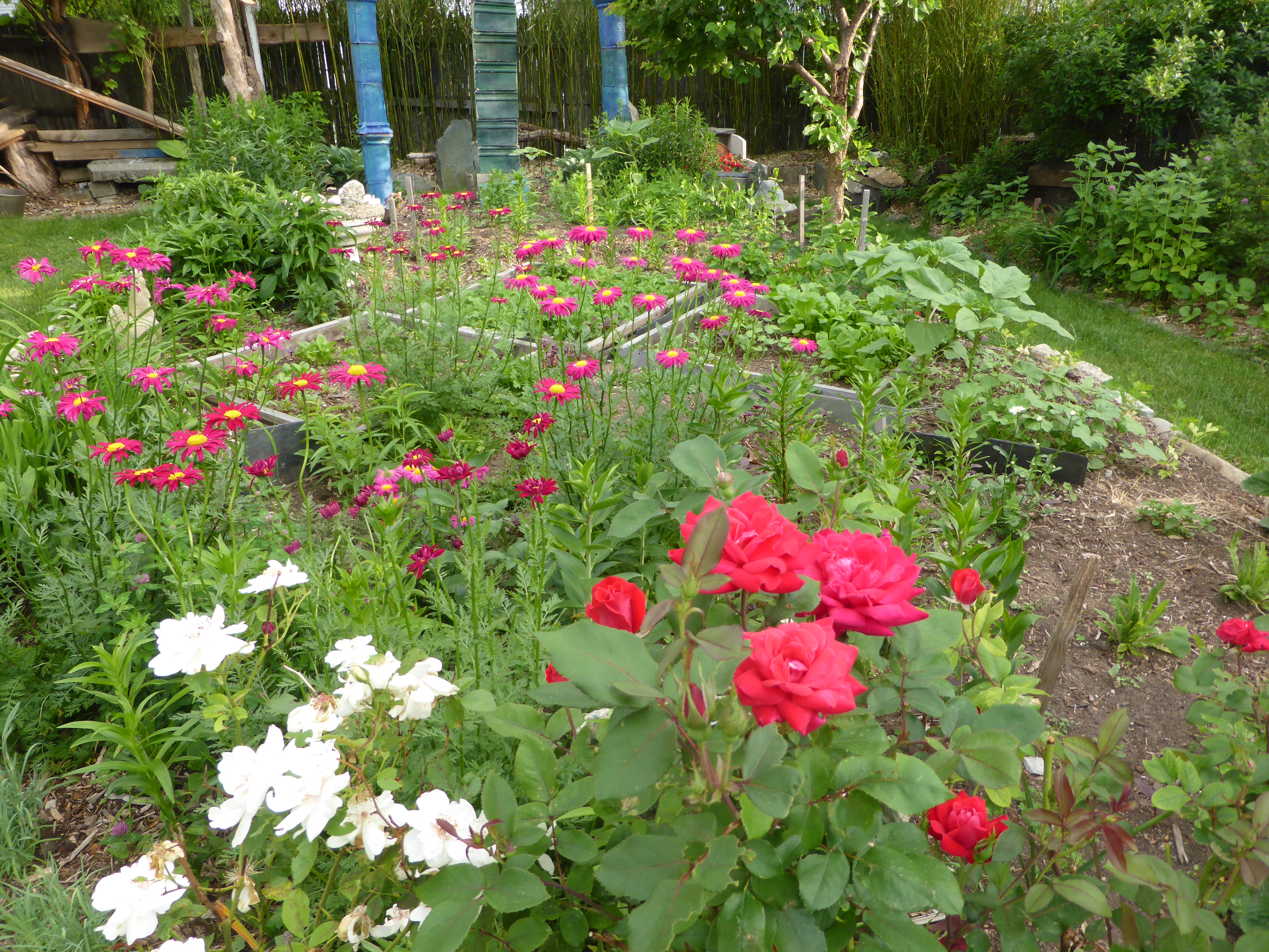 Why not? Roses, iris, false indigo, foxgloves, violets, and honeysuckle are there to welcome us. Lettuces, endive, kale, Swiss chard, chives, and peas are at the top of their game. Long gone are the days of mono culture. Urban gardeners’ passion is discovery. Diverse plantings produce large yields from small spaces. Imagination creates vertical planting systems, some ingenious re-purposed wooden pallets lift strawberries from the larger footprint of horizontal beds. Or more likely, gardeners like variety.