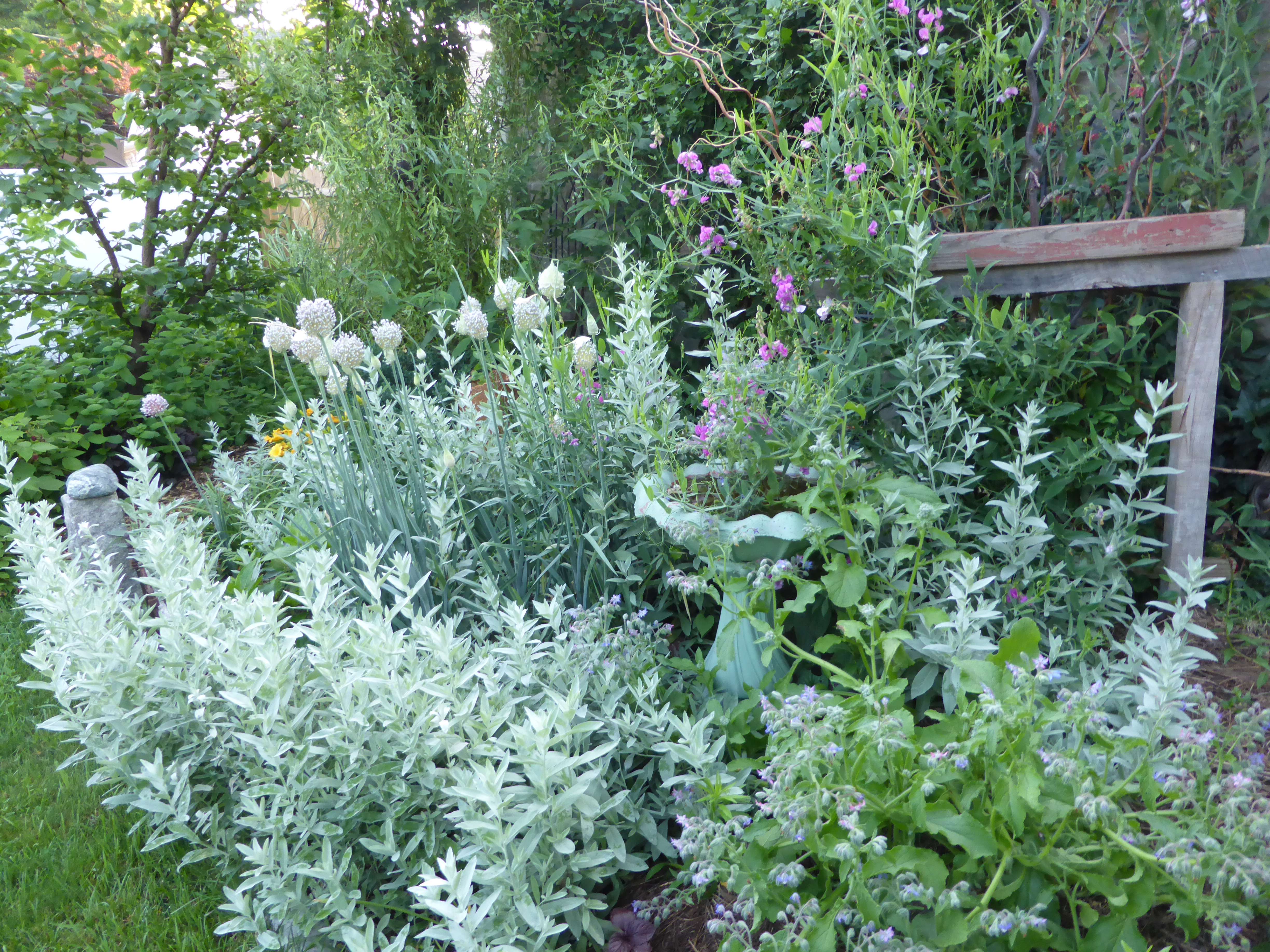 Gardens are cultural time capsules. Far too many urbanites are at a distance from their food sources. Nature’s dislike of vacuums fills our vacant lots with opportunistic survivors, some native to N. America, many others brought by waves of immigrants. Lots of common roadside plants were originally essential for an English household. Medicine, dyes, and beverages remain important to us, they are distilled, researched, and consumed in colossal quantities. Chemistry and industry have hidden roots. Urban gardens continue the once commonplace cure for bleeding, Achillea officinalis or “Yarrow” as pungent insect deterrents. The Utopian settlements efforts to be like the City on the Hill, began with seeds, cuttings, fodder brought from “This other Eden, demi-paradise, this fortress built by Nature for herself, against infection and the hand of war” Colonists arrived with Oberon’s bower a contemporary reality. Virtually all plants Shakespeare describes are widespread in N. America. They brought the essentials and discovered native herbs to include, like Joe Pye Weed and tobacco.