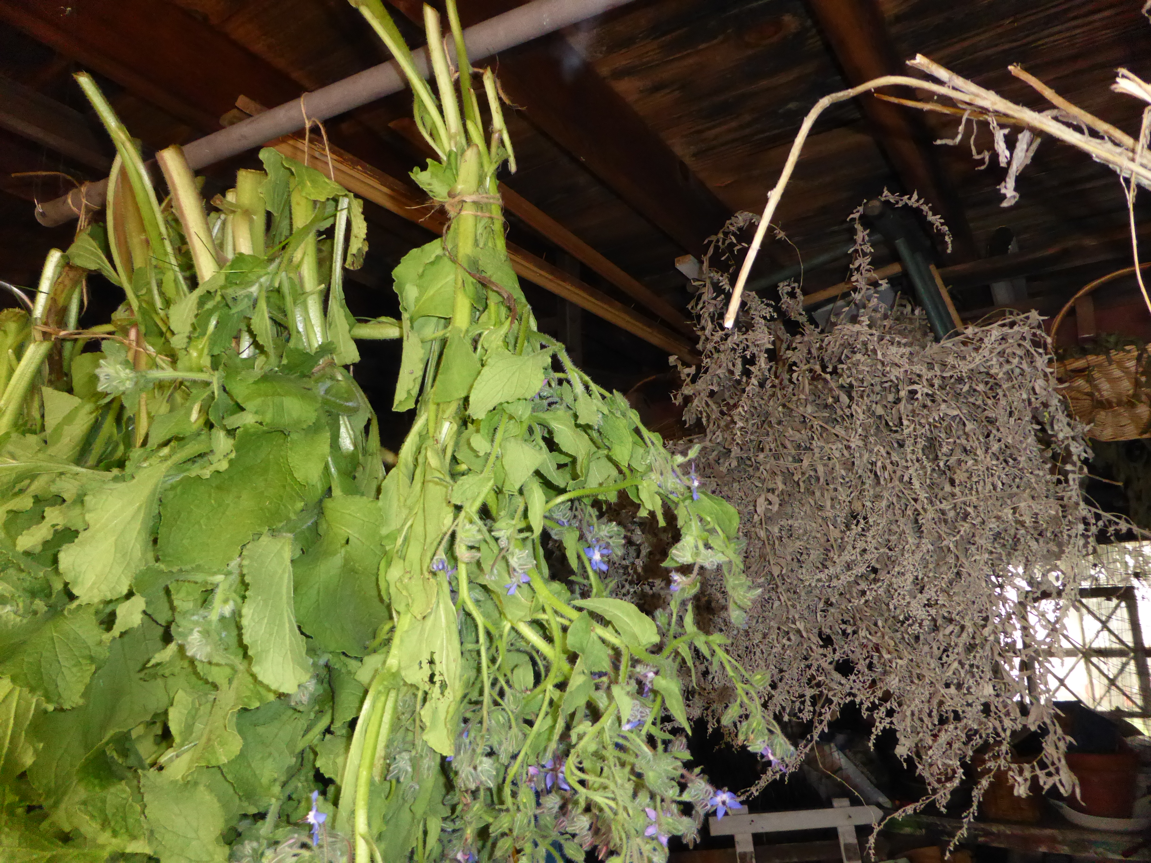 Herbs and flowers dry well. Tie into several smaller than one or two larger bundles and hang from a rafter under shelter, a garage or shed works very well. Be patient, most dry out in a few weeks, some in days. For smaller herbs such as rosemary or lavender, an old screen winter propped over open space in the garage or toolshed is better. Spread a thin layer of plant on the screen, place paper beneath to collect the fragrant chafe. You’ll soon have wicker baskets picked up for very little at yard sales or thrift shops full of fragrant herbs. I’ll take the fragrant garden any day, it is always with me.