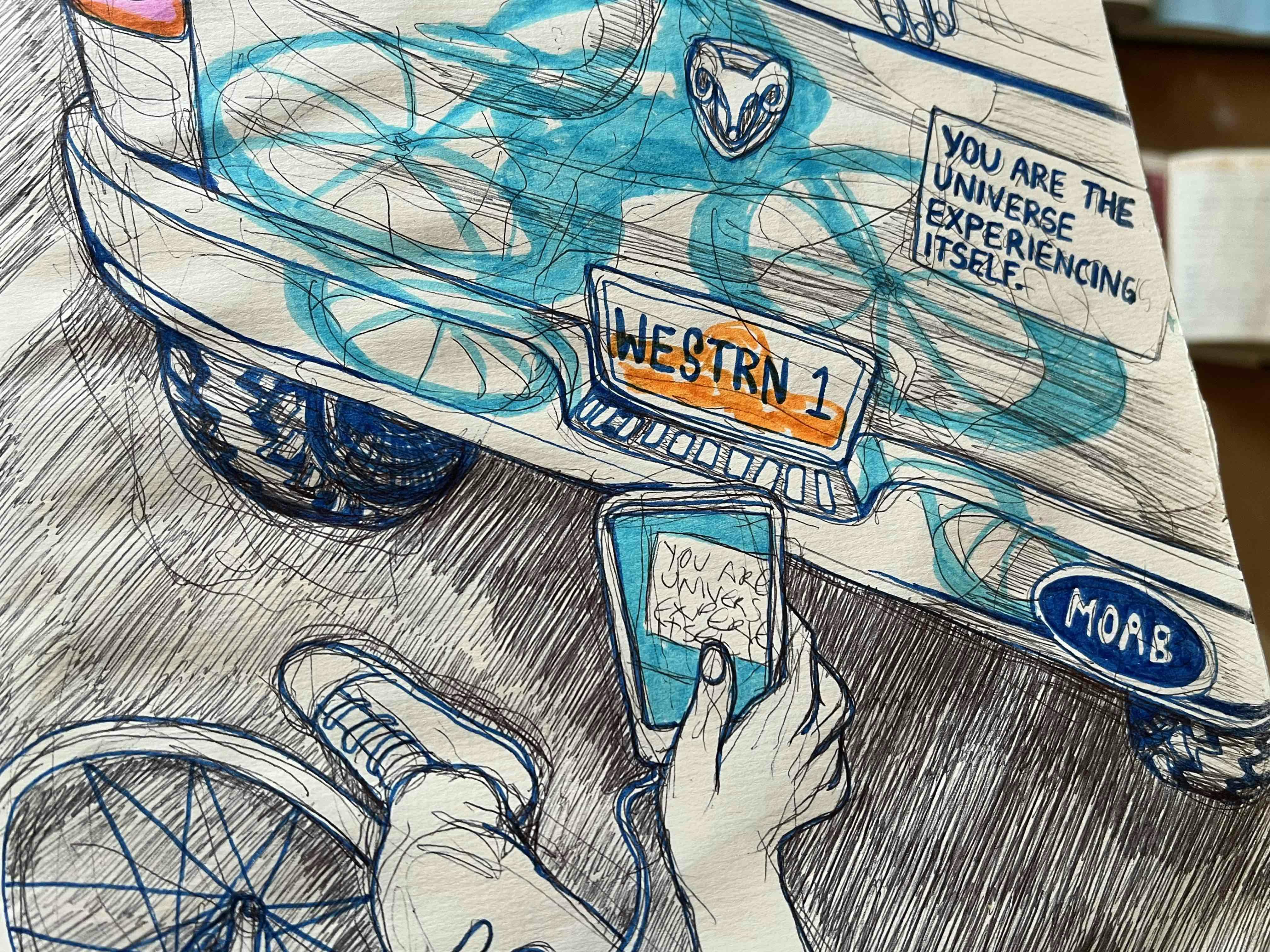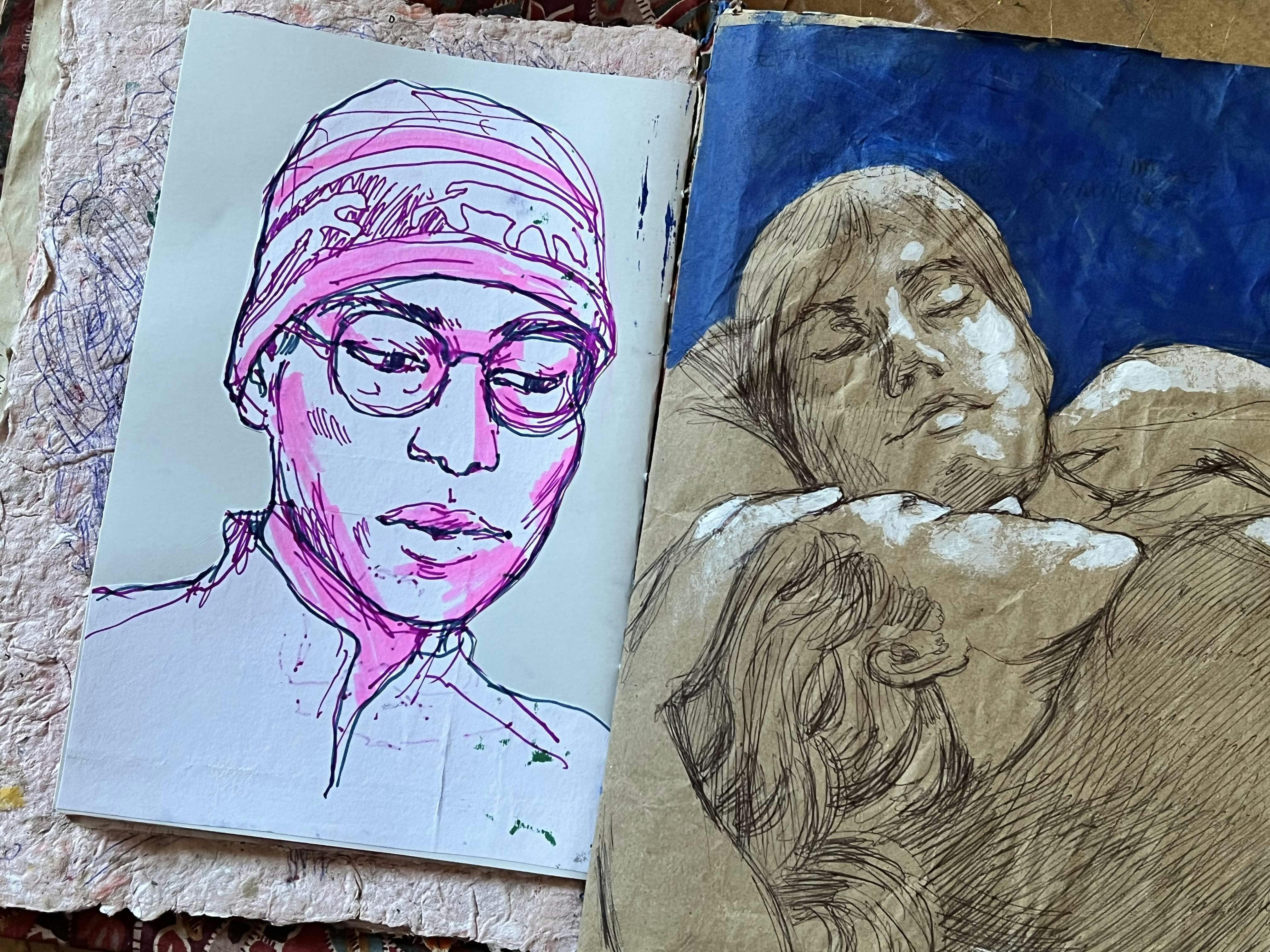 In addition to paintings, Kauffman has explored other media and is also a prolific sketchbook maker. In their studio, bespoke books created from hand-made and recycled materials are filled with expressive drawings rendered using materials like acrylic, watercolor, markers, and ballpoint pens. There are studies for paintings, ideas, and notes. The artist’s process is on display in these books.