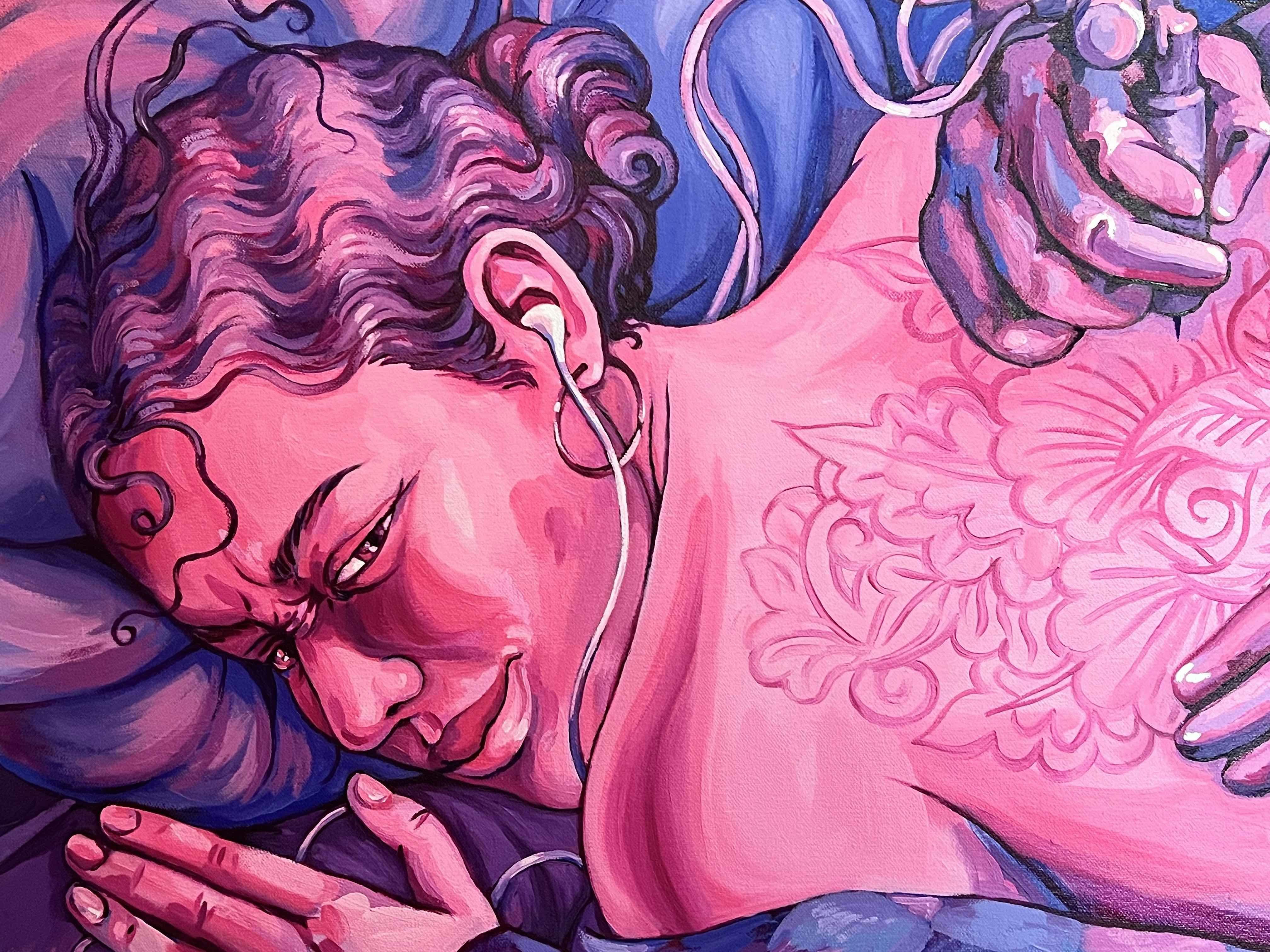 Kauffman’s works do transport those who engage with them. They invite onlookers into environments and storylines that are familiar. In one painting, a prone sitter gets a new tattoo, in another a dog wrestles with a toy. They are scenes from everyday life that show off the artist’s voice.