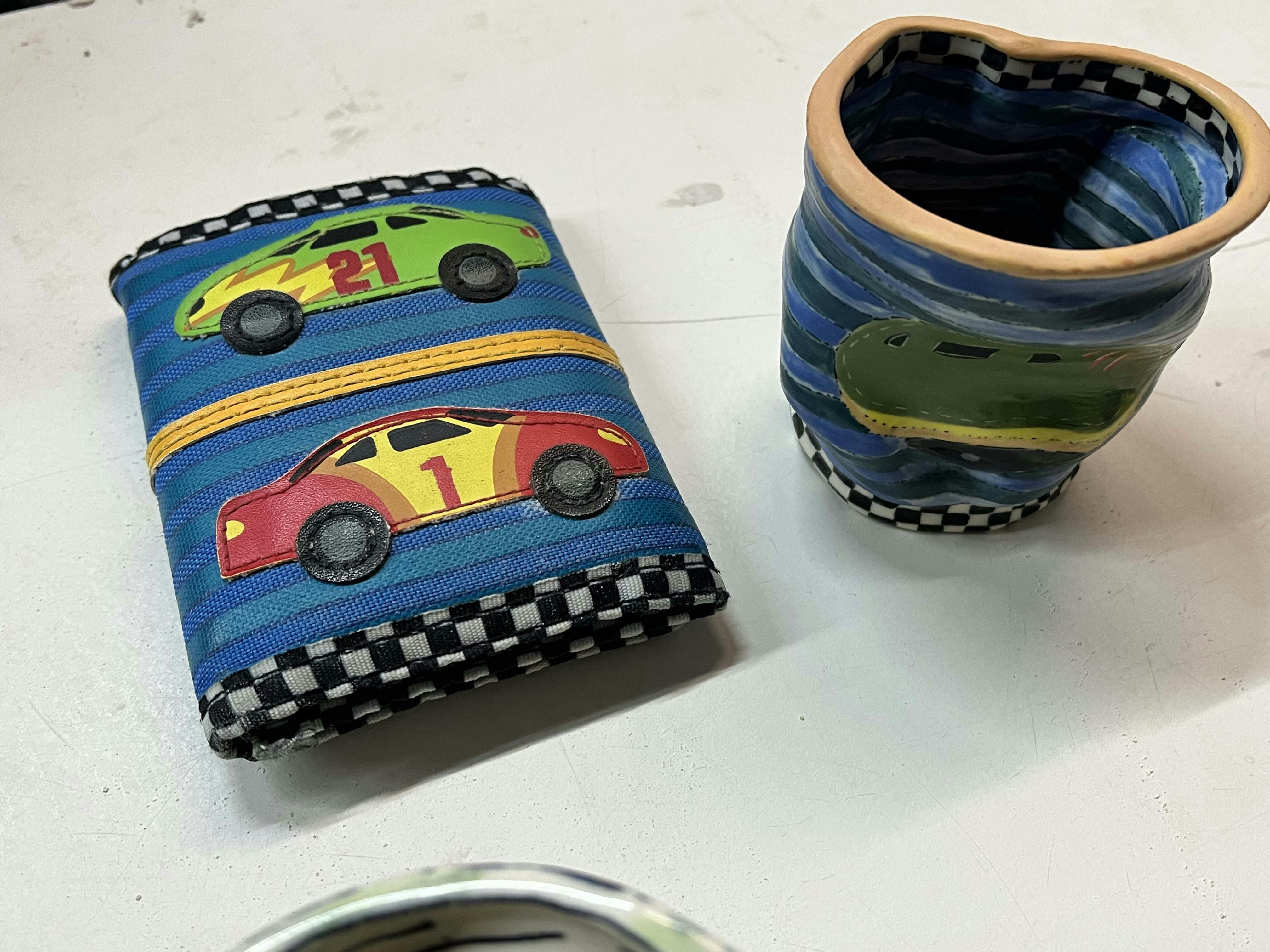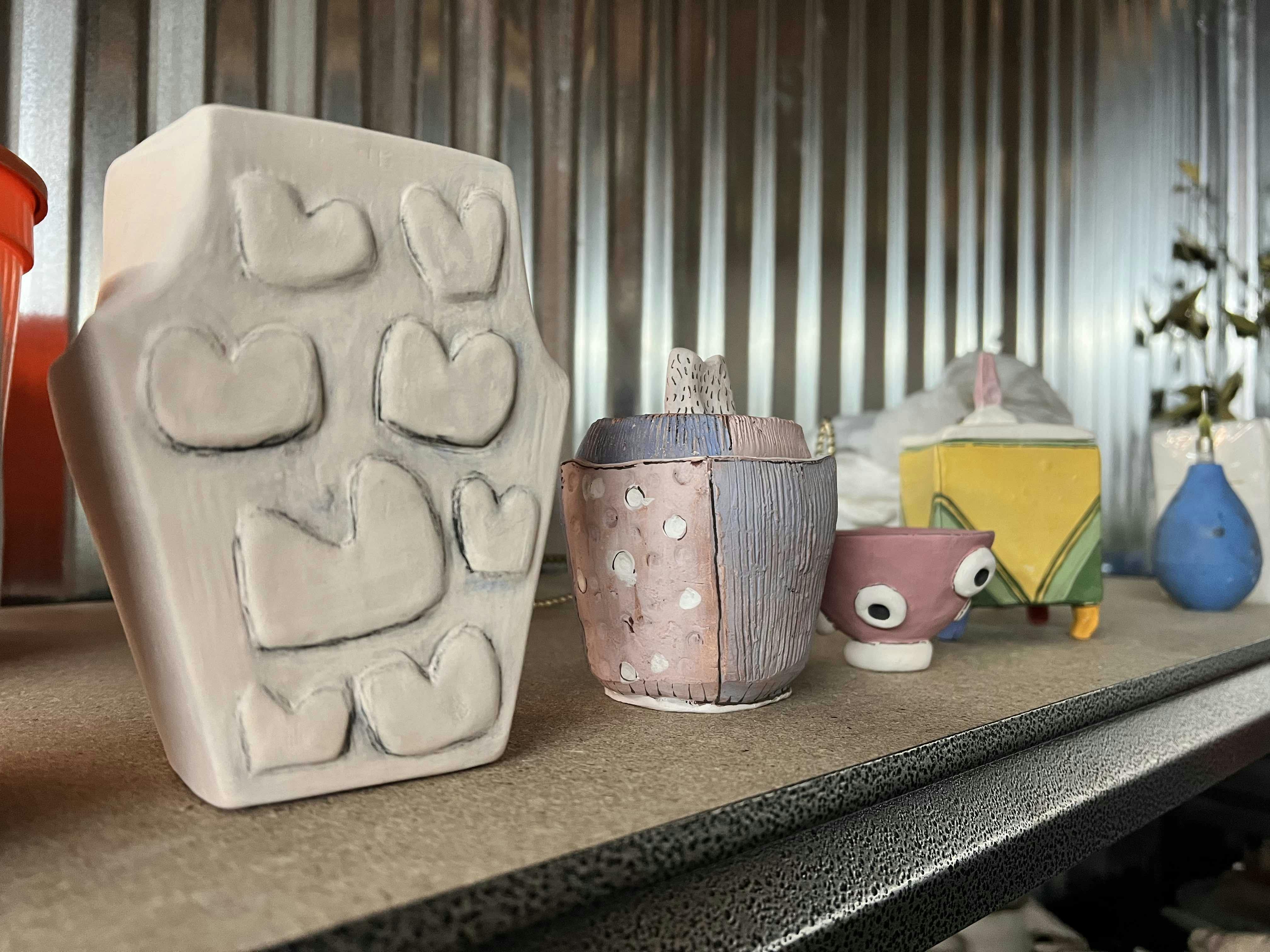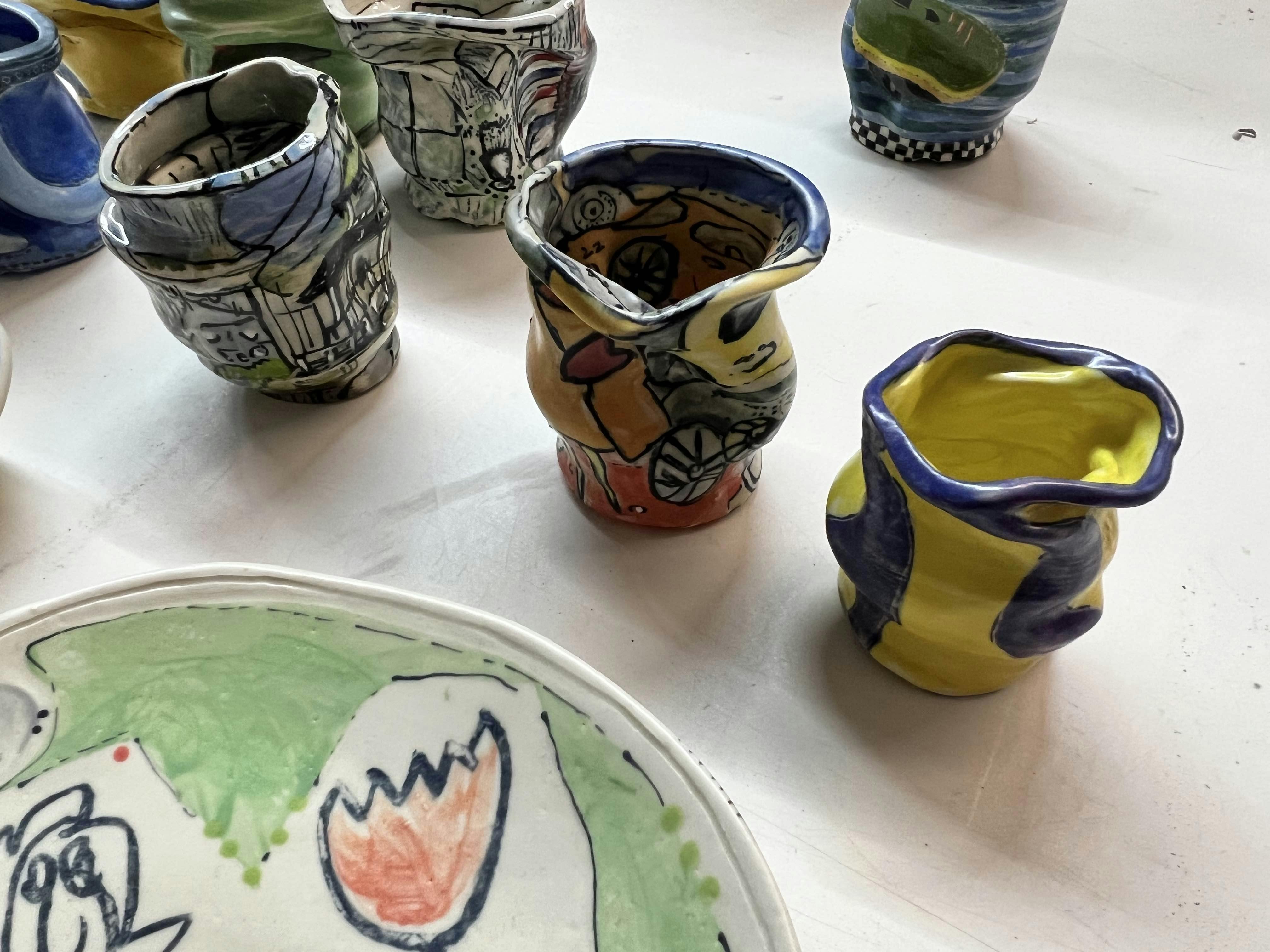 During a recent studio visit, Pittorf showed off finished pieces and works in progress. In one of their most ambitious projects, a large vase, ceramic Hot Wheels tracks criss-cross a painted map of the town in which they were raised making for a multi-layered experience. In another series of small but highly decorated vessels, Pittorf charts spaces and objects from their upbringing that relate back to their exploration of queerness. All of Pittorf’s work is imbued with a keen sense for expressive drawing, bright color, and adventurous experimentation.