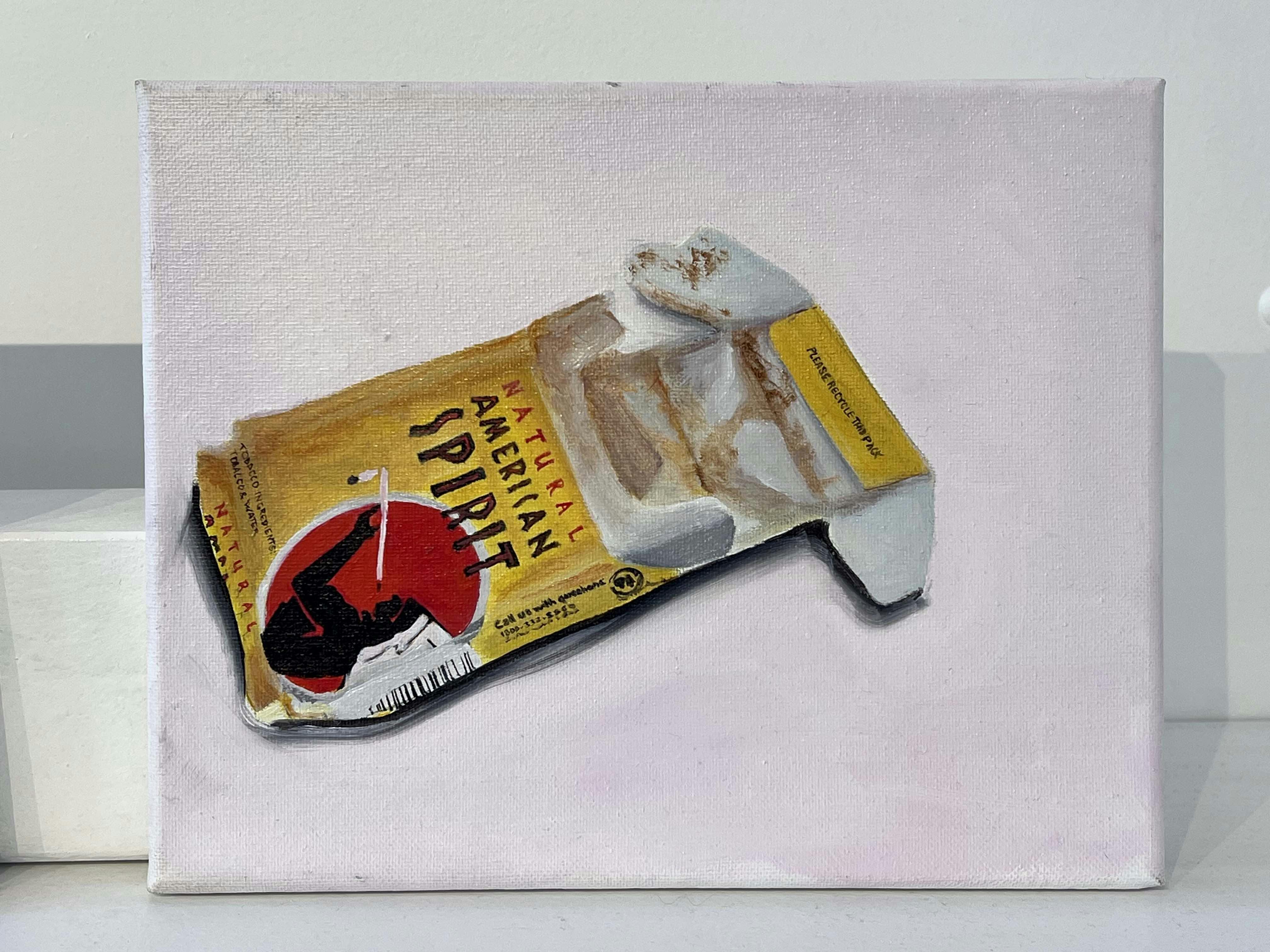 Beyond her familial portraits, Bryan is also showing a body of small paintings that focus on objects. Bubblegum wrappers, empty beer bottles, and crumpled cigarette boxes are some of the subjects. The scale of these pieces draws in the eye and invites the viewer to look closely in order to better appreciate Bryan’s adept skill for capturing tiny details.